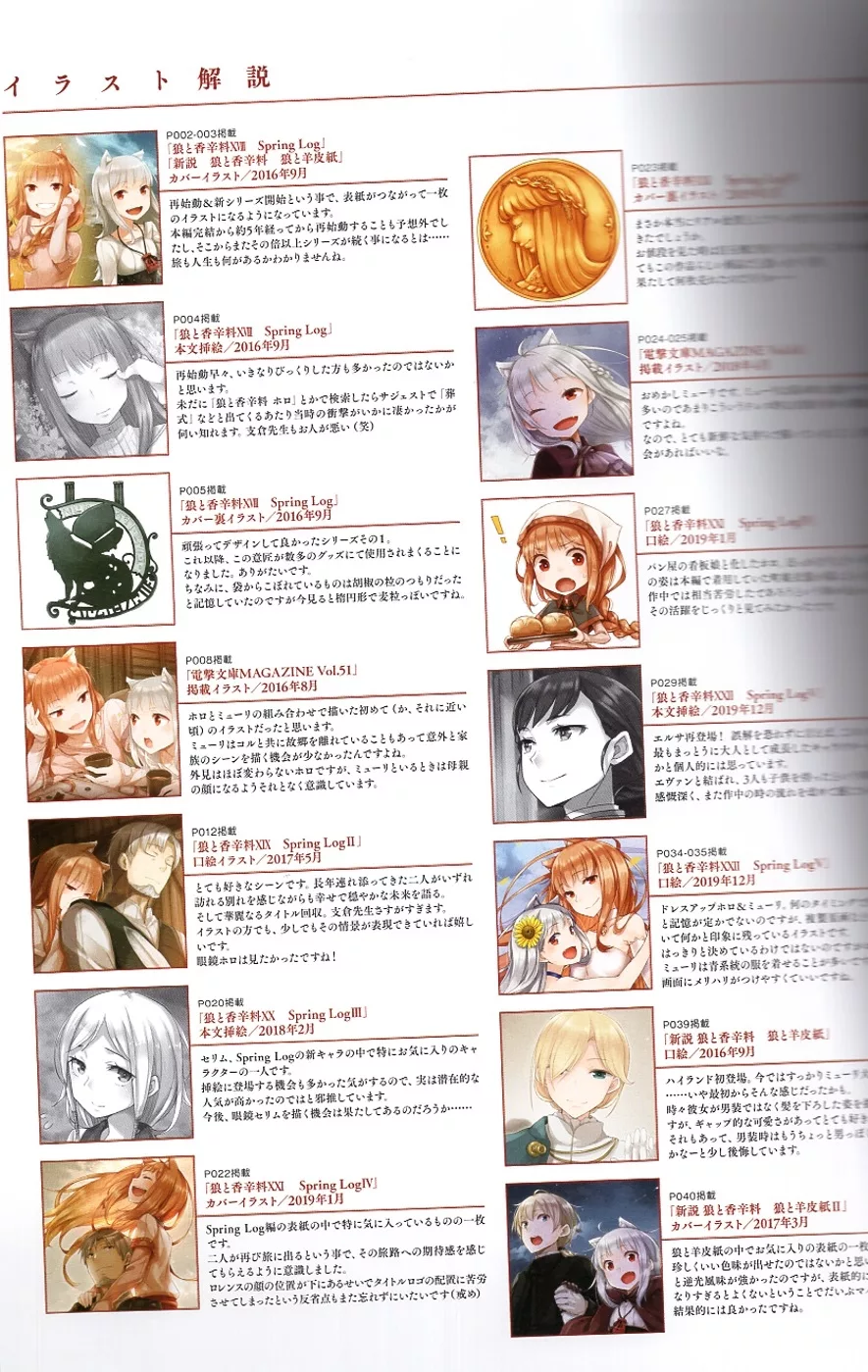 第二本畫集網羅了電擊文庫《狼與辛香料 Spring Log》第18卷~第22卷&電擊文庫《新說 狼與辛香料 狼與羊皮紙》第1卷~第6卷的全部插畫,以及許多由文倉十所繪製平常比較罕見的插畫作品,例如電擊文庫MAGAZING、電擊文庫公式海賊本、電擊文庫展示會插畫、聯名企劃插畫等。此外,還收錄了支倉凍砂全新創作的掌編小說《狼與旅的記錄》。