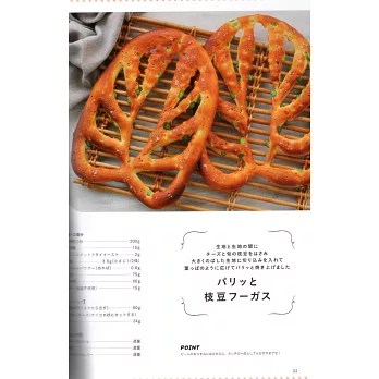 在二張麵皮之間夾入起司和新鮮毛豆,然後進一步加以捍平,再劃上葉脈狀的刀痕,放在烘焙紙上再加以延展拉開。烘烤之後,便成為香脆的葉片形狀佛卡夏。