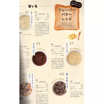 送上包含了甜味系的「Whip butter、Lemon butter、Cocoa butter、黑芝麻紅豆butter、果乾butter」&鹹味系的「番茄羅勒butter、大蒜巴西利butter、鹽昆布櫻花蝦butter、明太蔥butter、辛香味堅果butter」10種風味的抹醬食譜。