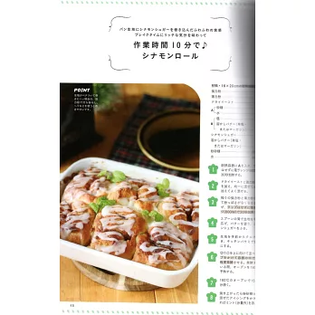 作業時間只要10分鐘的這款肉桂捲,是在麵糰裡捲入肉桂糖來製作。綿密鬆軟的口感,很適合午茶休息時間來享用。