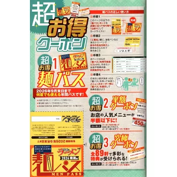 可使用「麵PASS」的58家店舖列表、可使用「半價優惠券」的16家店舖菜單、以及區域別的「究極優惠券」和兌換項目介紹,都在這裡一次收錄。