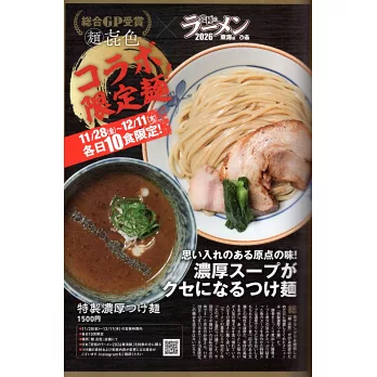 獲選為綜合GP的冠軍麵得主「麵 㐂色」,特別準備了限定版的「特製濃厚沾麵」來回饋本誌的讀者。有興趣的朋友,快來看看相關的期間和規定。