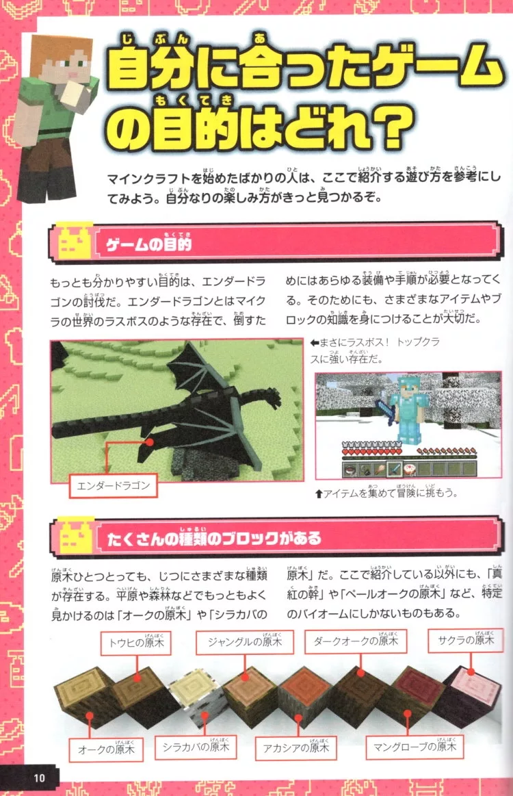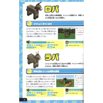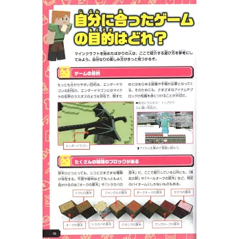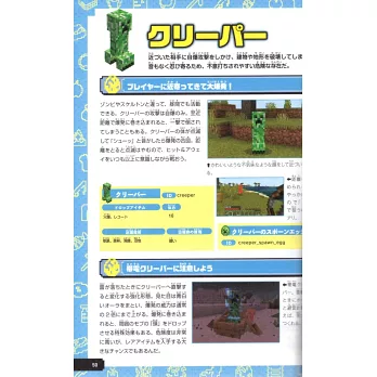 2011年,正式在任天堂發行的遊戲《Minecraft》,玩家們可以在遊戲的方塊世界當中盡情的遊玩探索,還可以與怪物們打鬥,是一款老少咸宜的遊戲。在遊戲當中出現的遊戲角色還有遊戲道具,更是滿足了有收集癖好的玩家們。「MINECRAFT角色&遊戲物品圖鑑解說手冊」,收集了遊戲當中全部的角色、遊戲道具、遊戲數據, 讓喜愛這一款遊戲的朋友們可以一次收藏所有的遊戲內容。