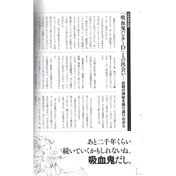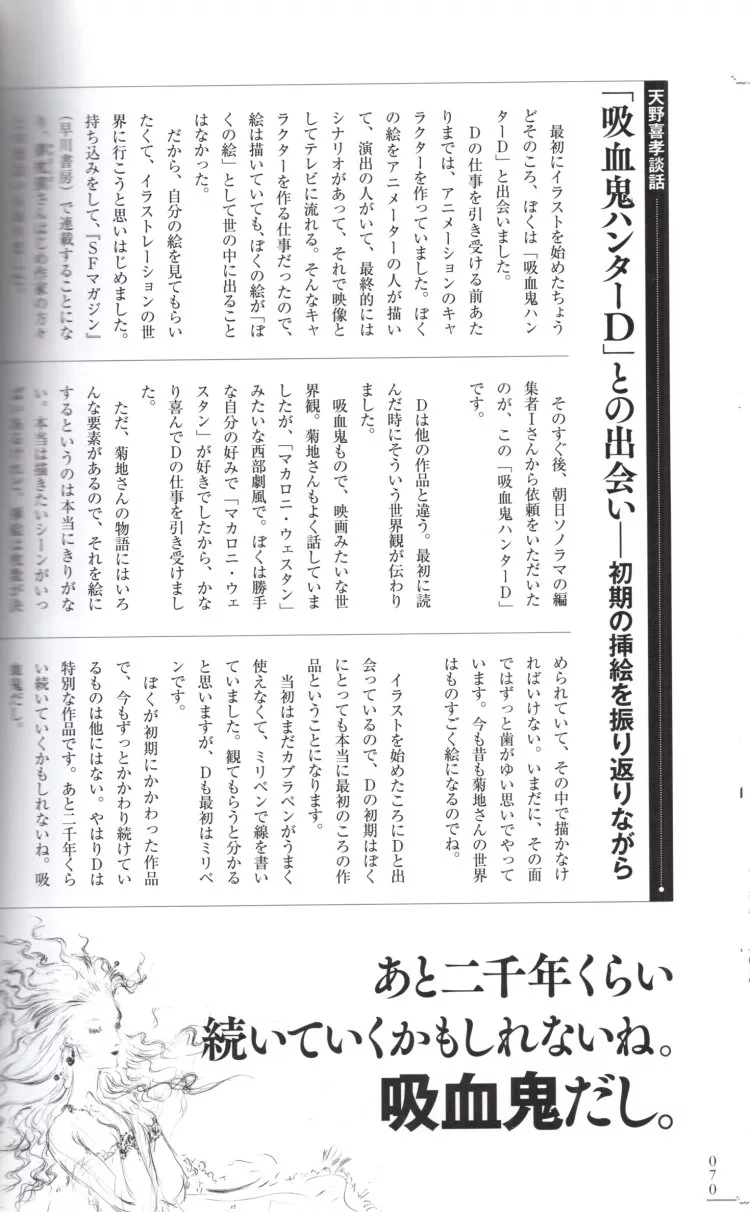 五度獲得星雲賞,享譽國際的藝術家天野喜孝,曾經為《Final Fantasy(最終幻想)》系列設計LOGO與影像插圖,並以其纖細、妖艷、奇幻的筆觸,為菊地秀行所創作的系列小說《吸血鬼獵人D》持續繪製40多年的插畫。從1983年的第1卷起開始,到2026年1月出刊的第44卷為止,43年來針對《吸血鬼獵人D》系列所繪製的插畫作品,這回都集合起來選在第44卷發行當天,同步推出這一冊插畫集。