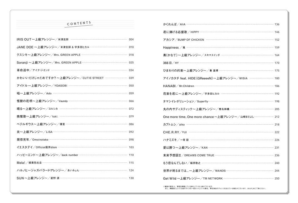 「IRIS OUT」「JANE DOE」などの話題の新曲から「丸の内サディスティック」「One more time, One more chance」などの定番曲まで、全40曲を中級 or 上級アレンジで収載しています♪