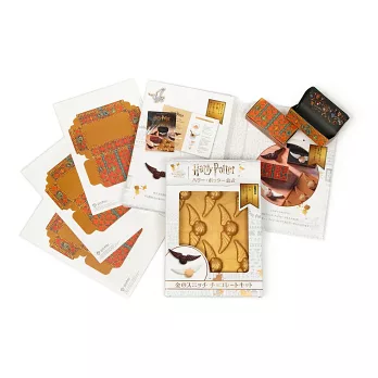 附巧克力金探子模組&筆記本。提供金探子造型巧克力模具組,內容包括金探子巧克力模具1個(尺寸約20x14公分,主要材質矽利康),霍格華茲學院風的包裝紙盒8個(需自行摺疊組裝)。以及巧克力蛙A5全彩筆記本1本(尺寸約21x14.8公分,184頁)。