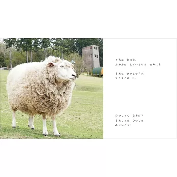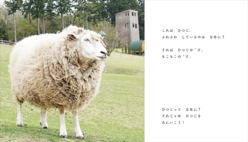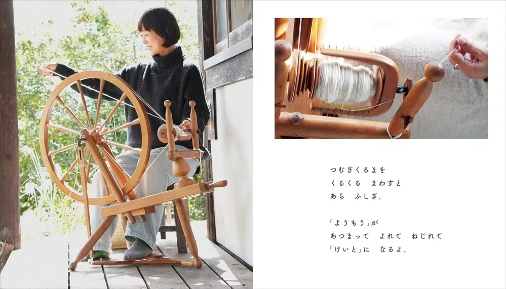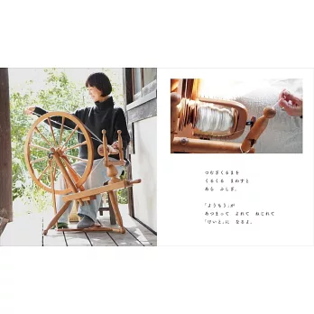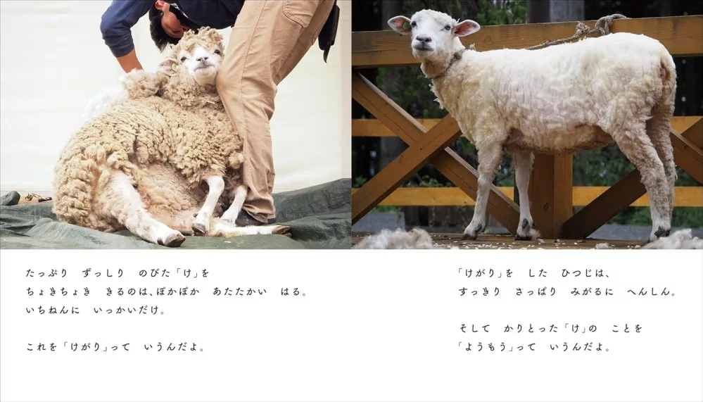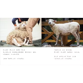 牧場にいるたくさん羊、毛刈りの風景、糸を紡ぎ、染める工程をオール写真でリアルに見せます。