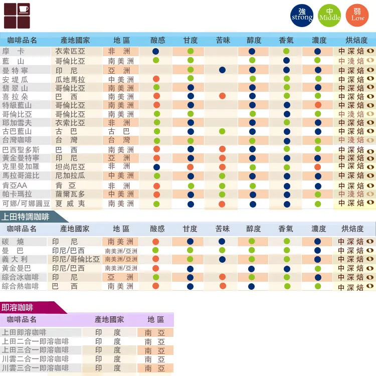 上田咖啡 上田有鑑於烘焙技術即是左右咖啡品質的重要關口,於是在 1995 年設立自家烘焙廠,從生豆的選擇到烘焙調配的最後製程皆一手掌握,期許能讓每位喝過上田咖啡的老饕們,皆能口齒留香。 上田堅持著高水準品質,所銷售的咖啡豆皆處於最佳風味態,除了長年供應的咖啡豆系列之外,我們也會提供一些獨特風味的咖啡豆。 上田的服務人員隨時都樂於為您介紹各種風格獨具的咖啡豆,幫助您發現更多您所喜愛的咖啡豆。 我們除了進口數十種各國精選風味的咖啡生豆外,還有數種本公司精心烘焙之咖啡,供業者及消費者批發和選購。除此之外本公司還可依各人或相關業者自行設計代為加工,或是針對您的需求代為設計研發您所想要的商品;代工項目包括有烘焙、研磨、包裝。 2003年 嶄新的上田咖啡休閒莊園悠然而生,挑碳崎古道邊,翠綠的樟木林中,隱藏著一幢結合現代簡約美感,與自然生態工法興建的咖啡屋。順著山坡走勢而築的建築物本 體,隱匿在山林之間,頗有現代陶淵明結廬南山下的恬靜與安適,幾乎讓人忘卻旅途中的勞頓與塵世的煩憂,除了擴大咖啡烘焙廠規模,更負起教育下一代生活體驗 咖啡的責任。 我們的堅持 ★ 自家烘焙師,親自烘焙。 |