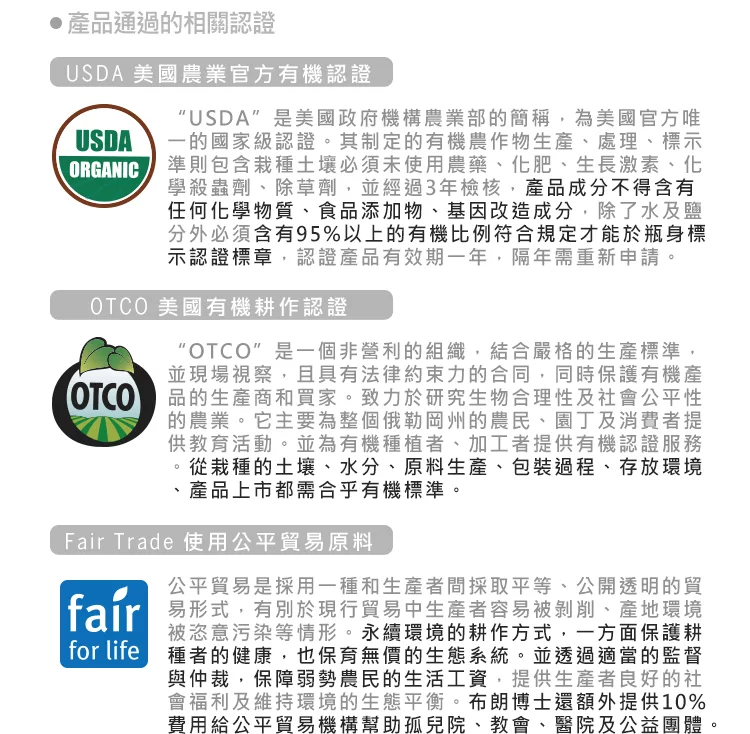 全成分:*有機蔗糖、有機白葡萄汁、*皂化有機椰子油、*皂化有機棕櫚仁油、*皂化有機橄欖油、有機shikakai萃取物、皂化有機大麻籽油、皂化有機荷荷巴油、檸檬酸、維他命E。*為公平貿易原料來源。