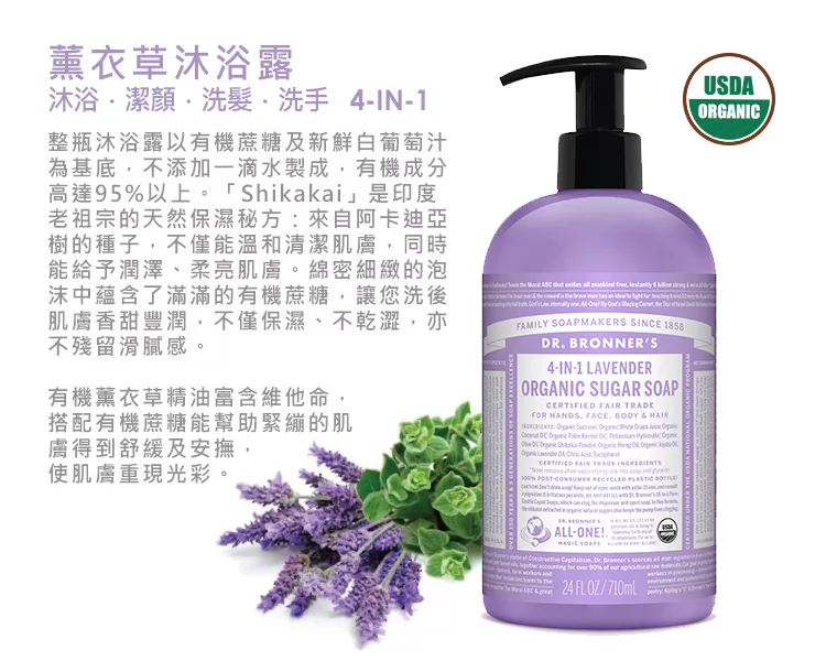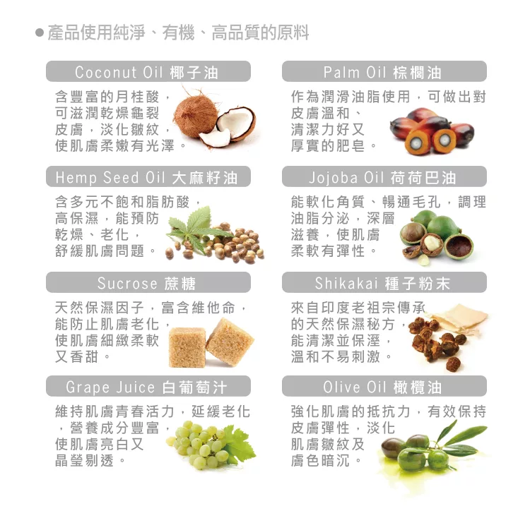 全成分:*有機蔗糖、有機白葡萄汁、*皂化有機椰子油、*皂化有機棕櫚油、*皂化有機橄欖油、有機shikakai萃取物、皂化有機大麻籽油、皂化有機荷荷巴油、有機薰衣草精油、檸檬酸、維他命E。*為公平貿易原料來源。