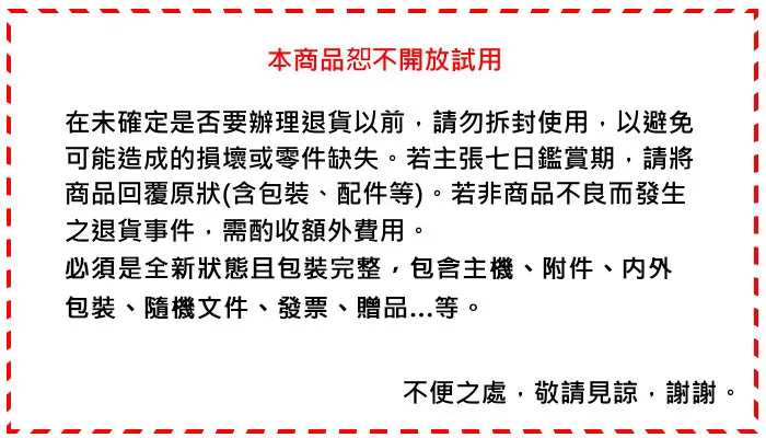 商品必須是全新狀態與完整包裝(請注意保持商品本體、配件、贈品、保證書、原廠包裝及所有附隨文件或資料的完整性,切勿缺漏任何配件或損毀原廠外盒),否則將可能視回收的商品及包裝之破壞狀態(如損傷、缺件、不當使用) 計算商品價值之損失,酌收額外的回復原狀費用,請您務必確認有購買需求後再行拆封,感謝您的配合。