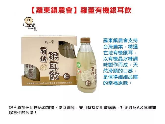羅東鎮農會支持台灣農業,精選在地有機銀耳,以有機晶冰糖調味製作而成,天然滑順的口感,同時堅持美味與安全,以成本較高之玻璃瓶為包裝容器,玻璃瓶能耐高溫高壓殺菌,不僅無毒更能留住美味,是值得細細品嚐的幸福原味!