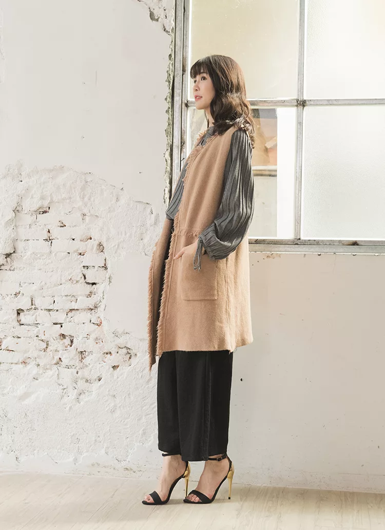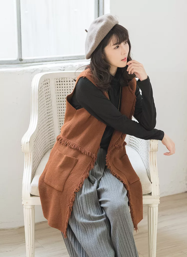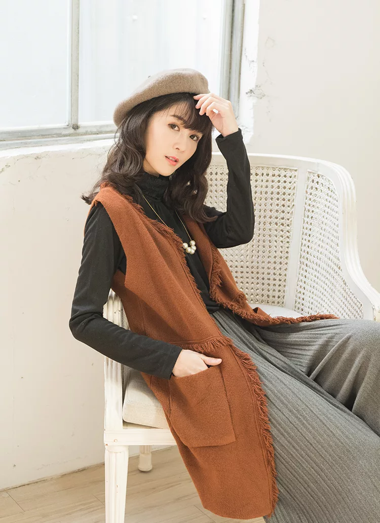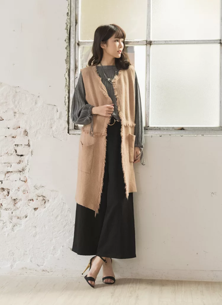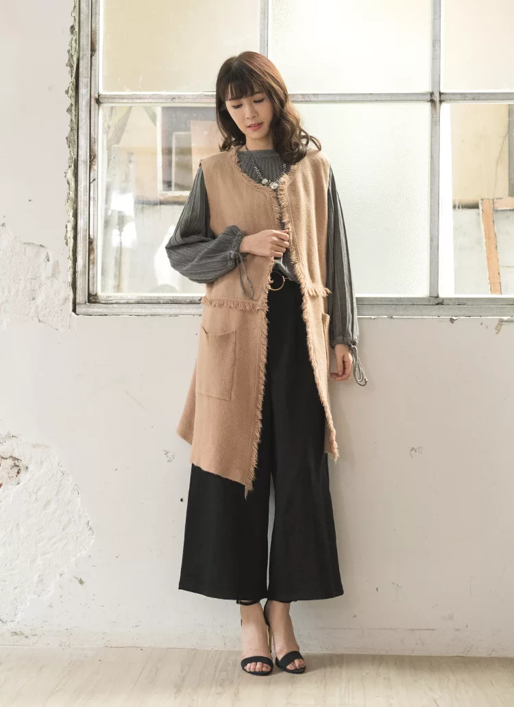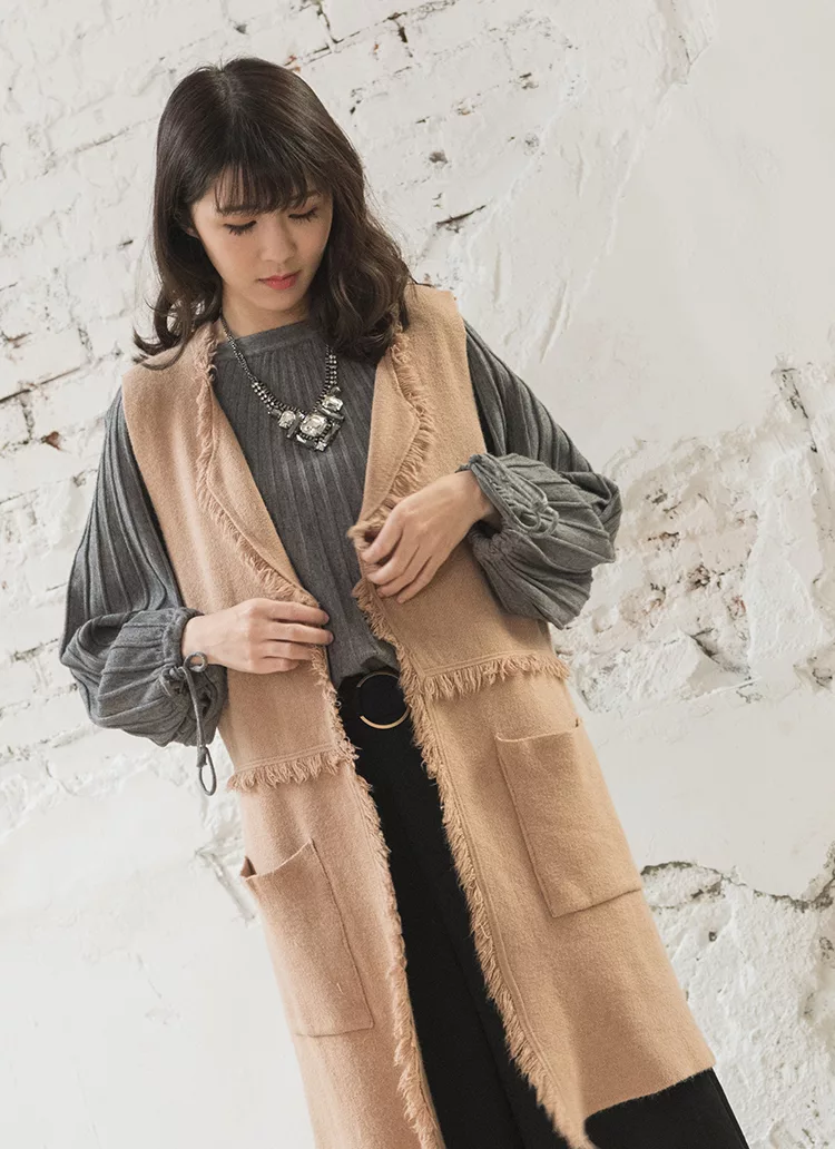 【KatieQ】毛鬚邊長背心針織罩衫-F 3201 FREE杏色