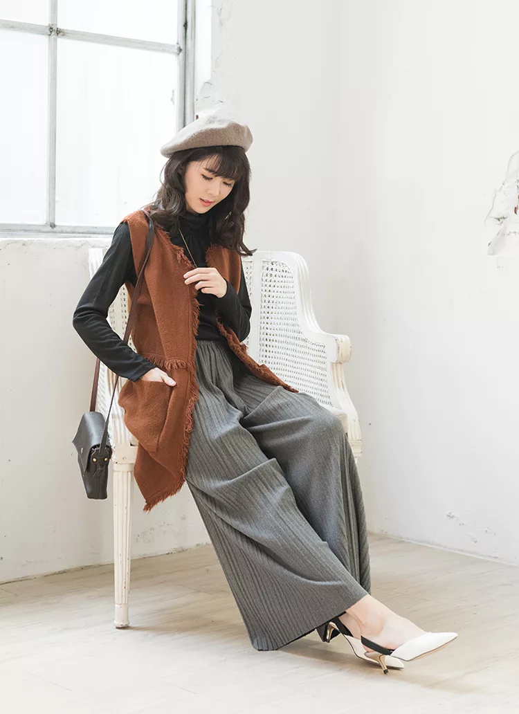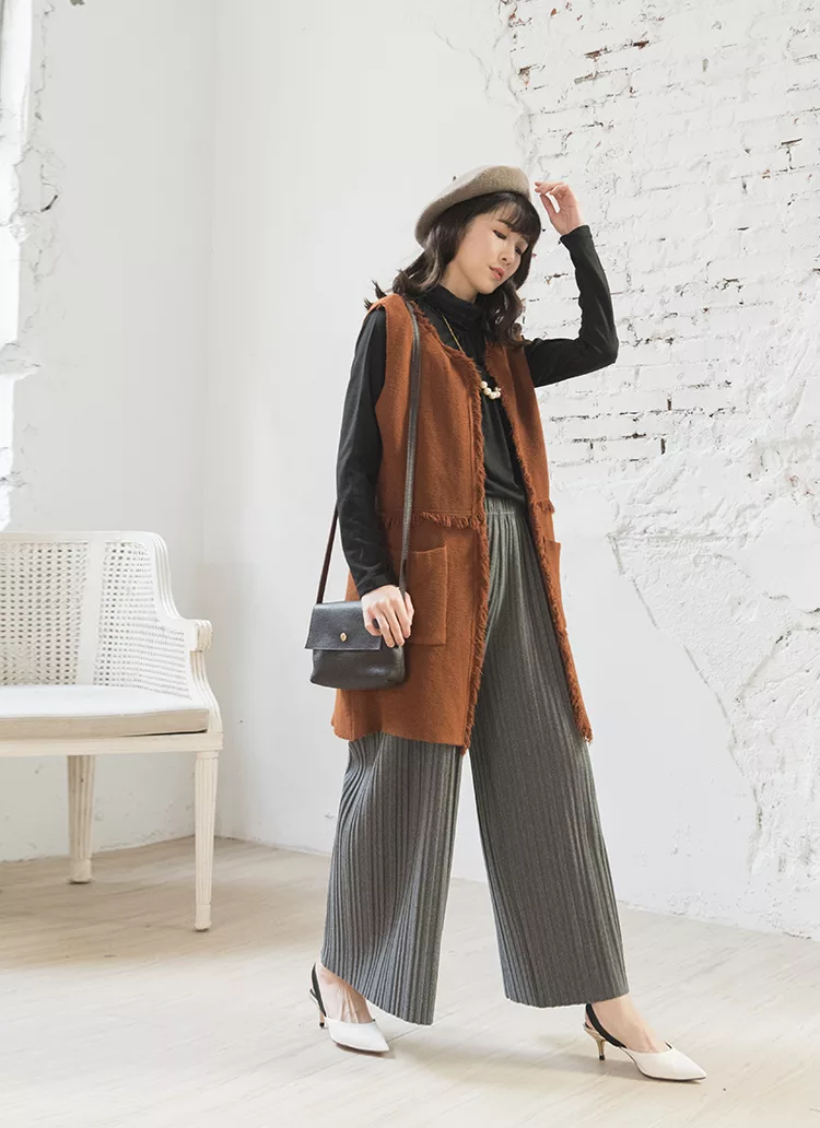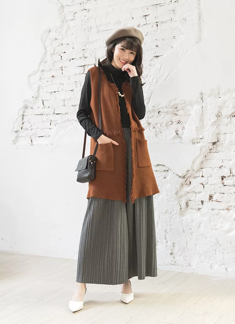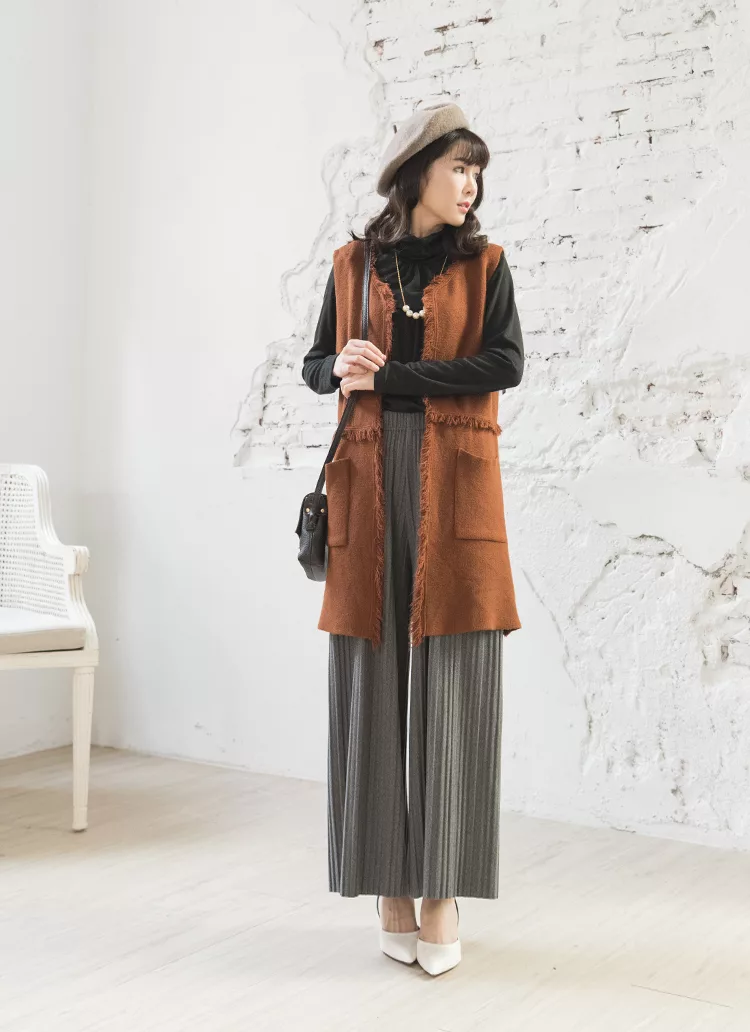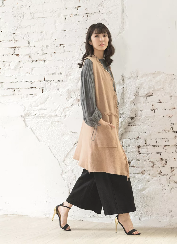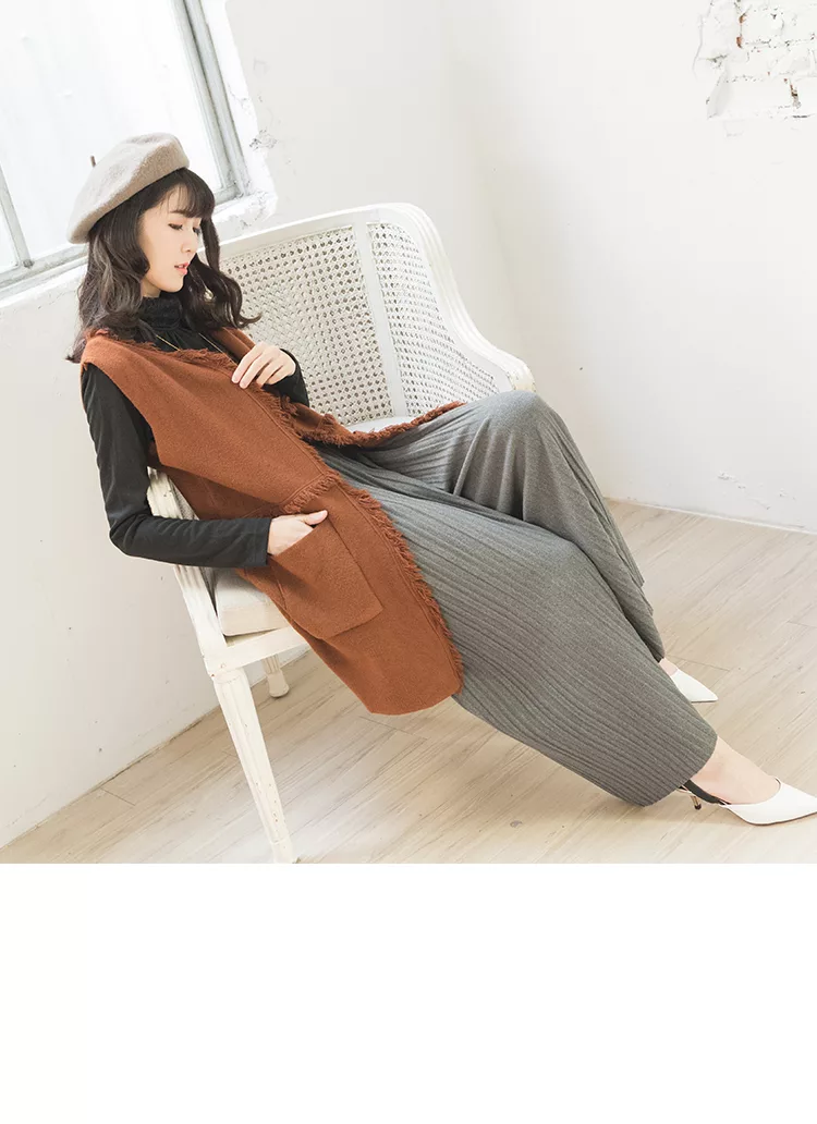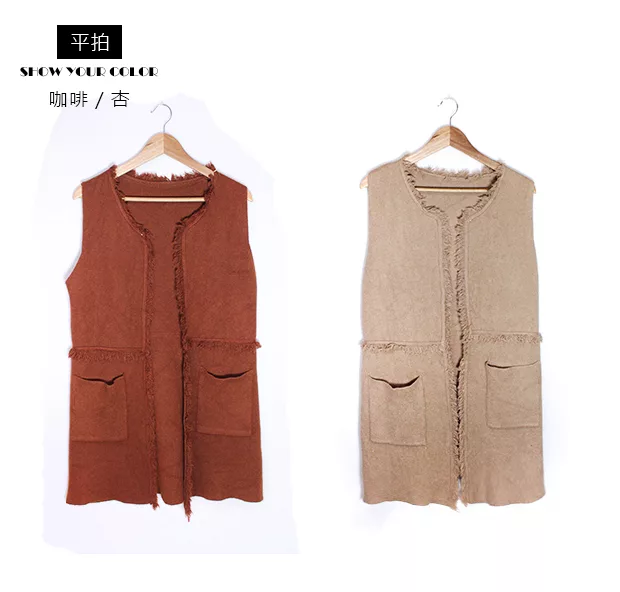 【KatieQ】毛鬚邊長背心針織罩衫-F 3201 FREE杏色