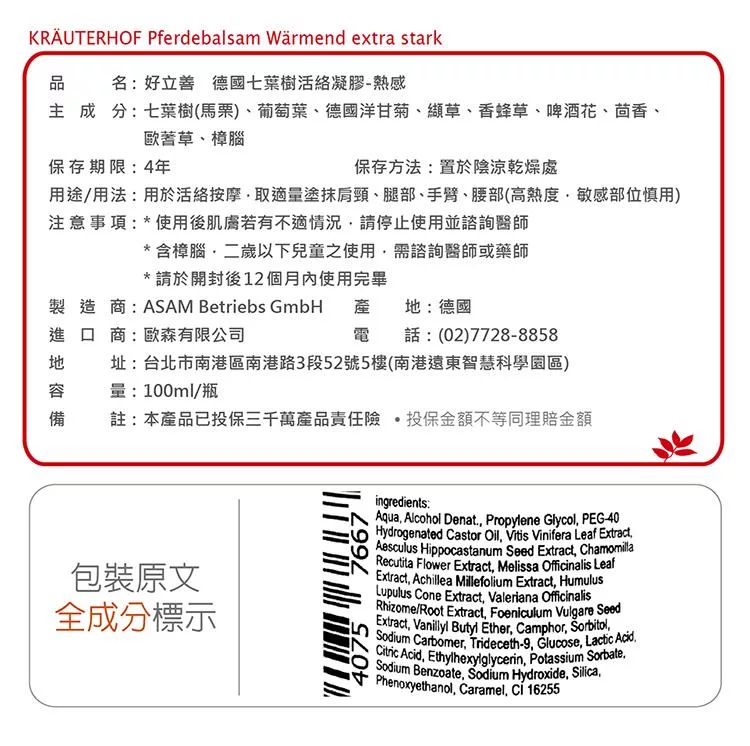好立善 七葉樹活絡凝膠-熱感 (100ml)
