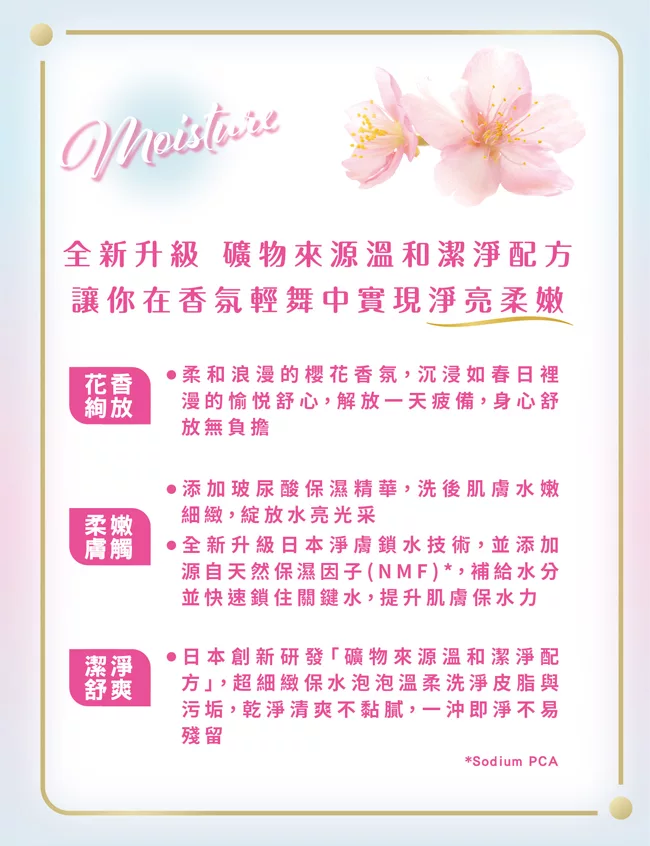 • 添加玻尿酸保濕精華,洗後肌膚水嫩細緻,綻放水亮光采
