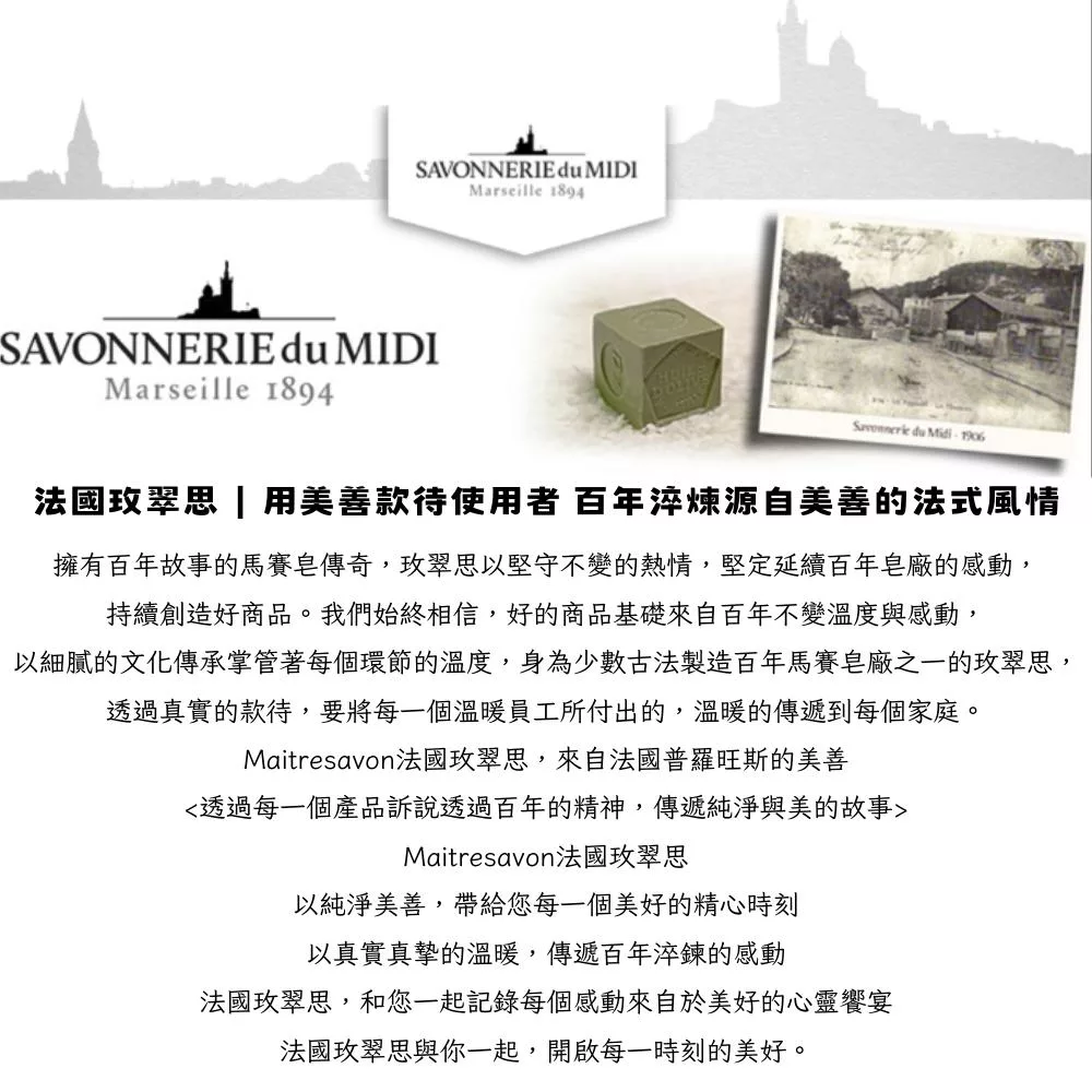 用美善之心款待每位使用者,您可以從玫翠思的產品中,感受濃郁的法國傳統風情,延續傳統製皂大師的技術
