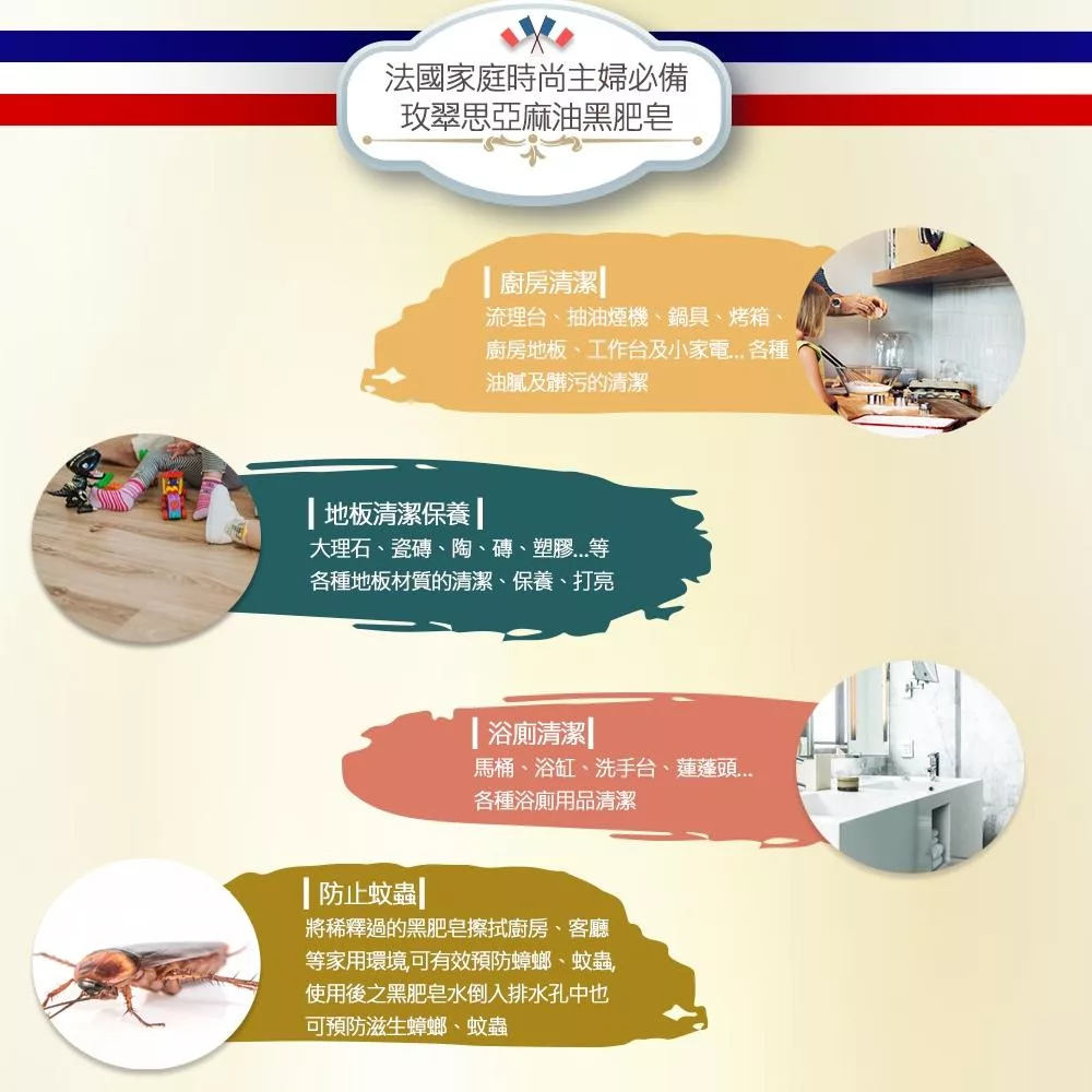 亞麻油黑肥皂獨特氣味能驅趕蚊蟲、蟑螂螞蟻,減少孳生疑慮。