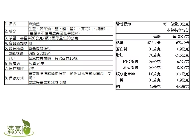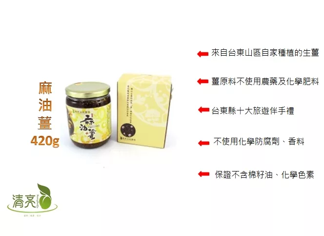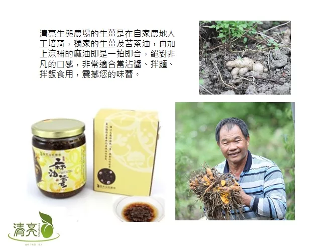 • 【內容物成份】生薑、苦茶油、鹽、糖、醬油、芥花油、胡麻油(芝麻)