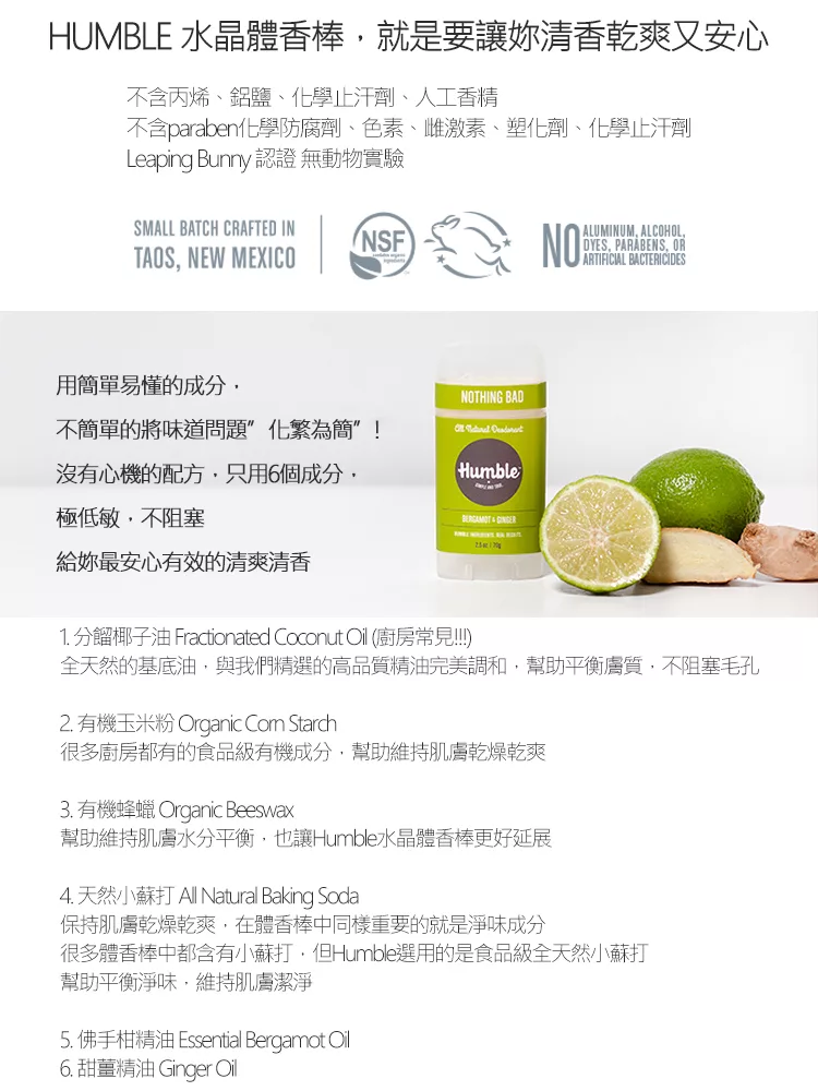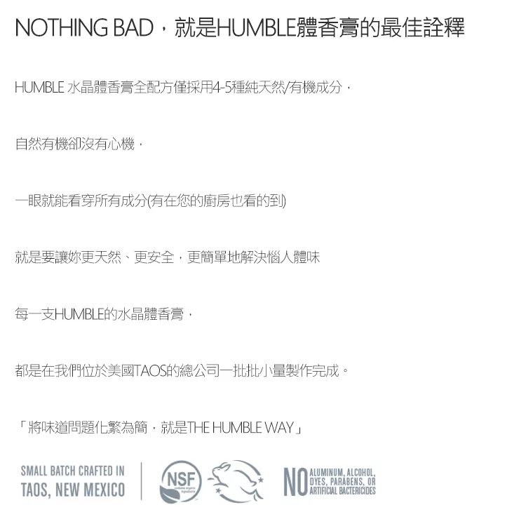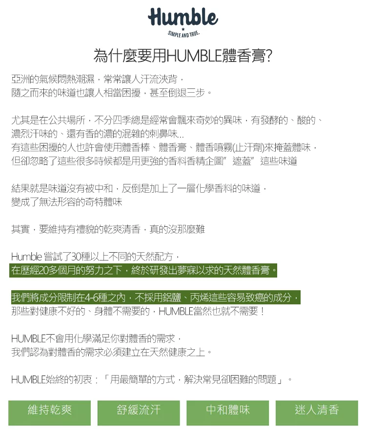 Humble 使用的是令人安心全草本天然成分讓肌膚常保乾爽