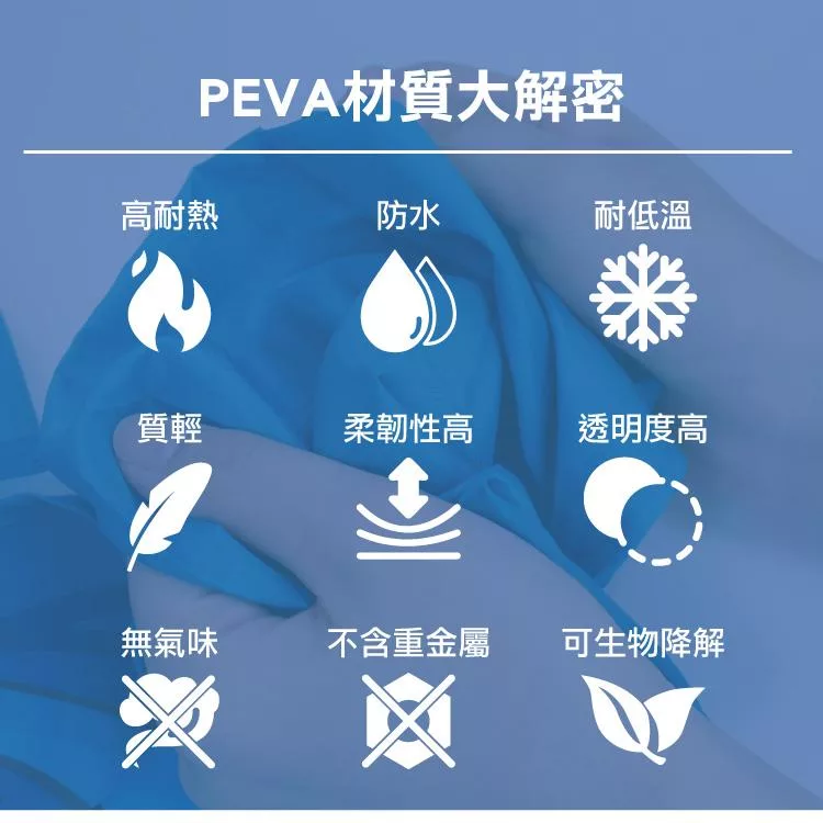 ● 採用PEVA材料,柔軟質輕,不會有一般塑料硬梆梆的觸感