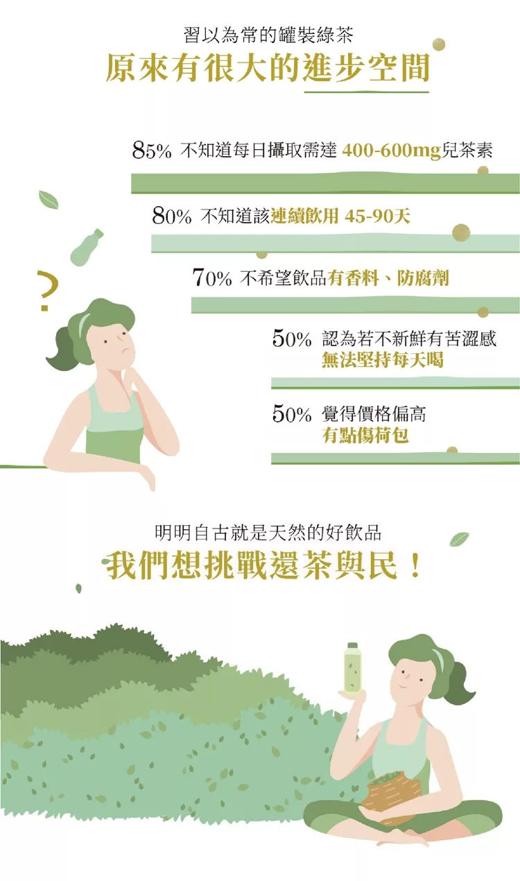 發現茶用心觀察現有產品及消費場景,並以問卷調查現有消費者,竟然發現有高達八成的消費者不夠認識該如何正確飲用健康綠茶;而又有五成以上的消費者,對於現有罐裝綠茶的產品感到有所缺憾!