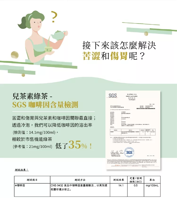 由於兒茶素和咖啡因是苦澀的來源,在目前的檢測條件下 (2hr 冷泡),兒茶素綠茶比市售的罐裝飲料含有較低的單位兒茶素 (50.0-75.0mg vs 61.6-92.4mg /100ml) 及咖啡因 (14.1mg vs 21.0mg /100ml) 含量,加上經過有機質的涵養讓它的甘甜度比一般的綠茶更高一些,因此喝起來的口感是相對較不澀口的;但是它仍有相當高的濃度的兒茶素與咖啡因,因此久浸後仍會有澀口的感覺和傷胃的可能性! 若對這兩個部份較敏感的消費者,可以考慮 1) 自行增加水量,讓濃度降低, 2) 飯後再飲用 等兩個方式,都能減緩不適感。