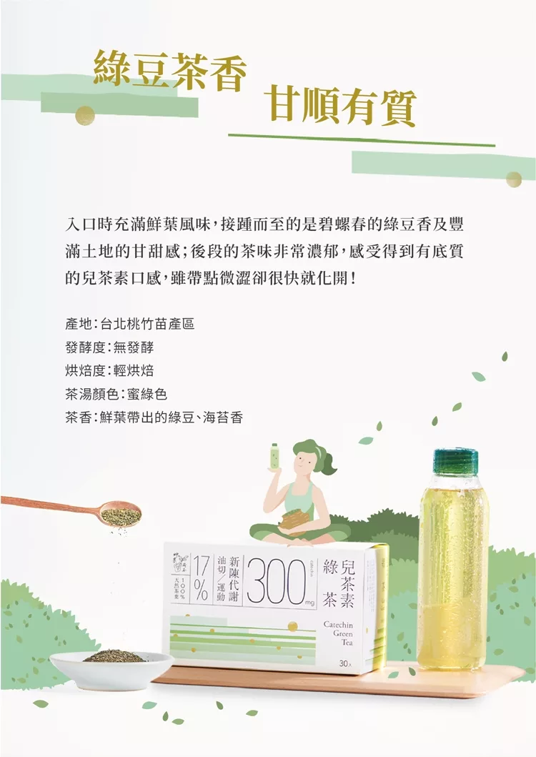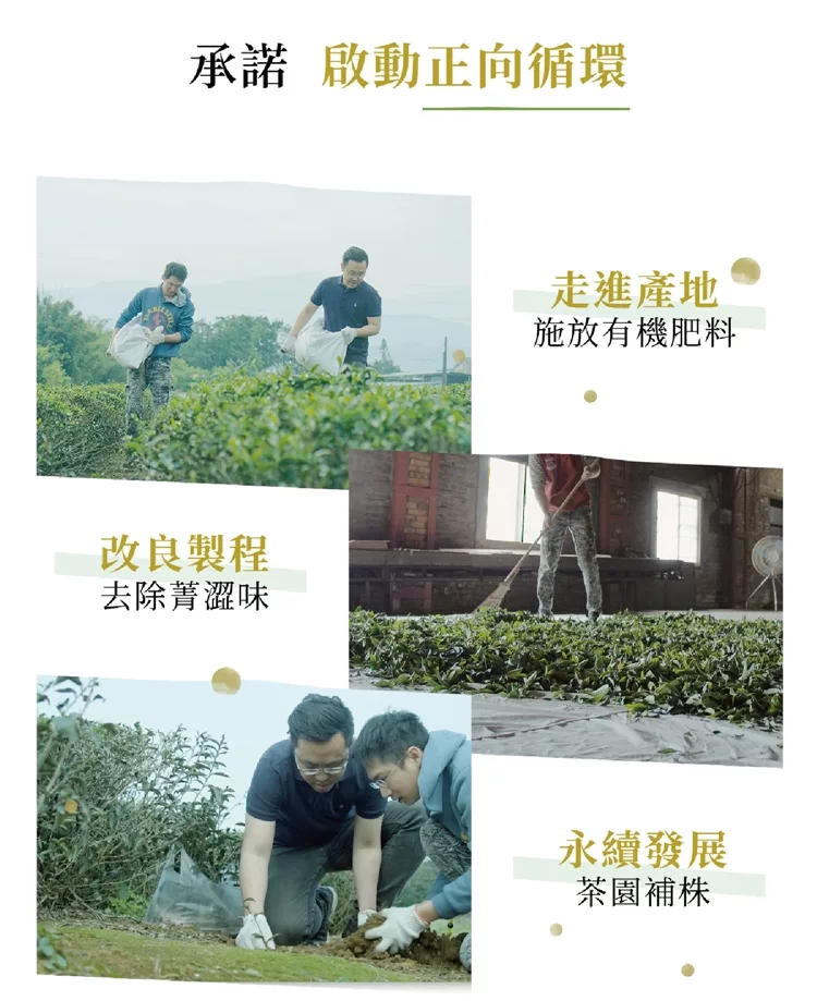 讓土壤變得肥沃,使茶園永續發展的同時也讓綠茶中的茶胺酸提升; 同時用碧螺春的攤菁製程技術降低菁澀味 ,讓茶香更顯,甘甜底蘊更厚實!