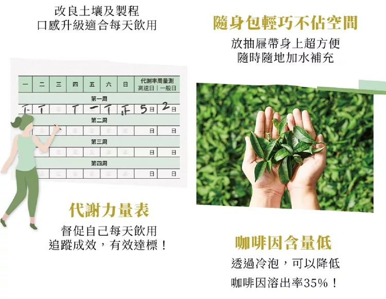 2「苦澀」甚至是「傷胃」:苦澀的來源是兒茶素和咖啡因,不應降低兒茶素健康成份的含量,但我們可以減少「咖啡因」並增加「茶葉的胺基酸」比例,就可以讓茶更甘甜而減少苦澀感,也更可以接受每日飲用!