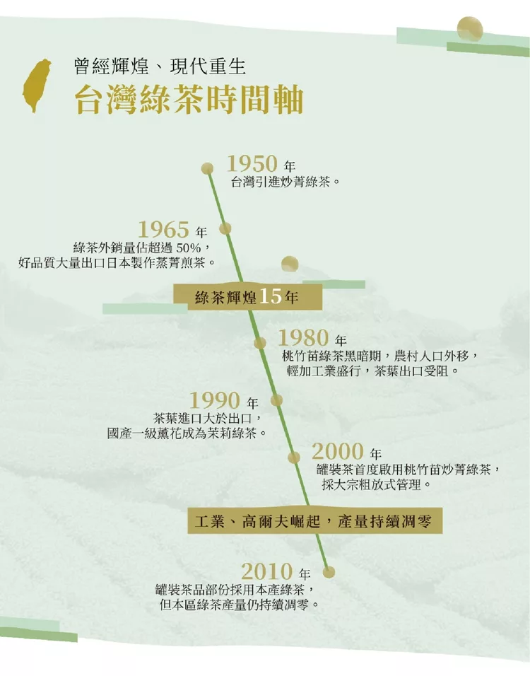 曾經台灣所產製的綠茶佔茶葉外銷產量的 50%,甚至桃竹苗產區還曾做出高品質煎茶,出口日本;然而近二十年來台灣純飲綠茶不受重視,罐裝茶飲也僅有部份原料採用本地產製,在粗放式管理下產區凋零很嚴重,品質亦不如當年。
