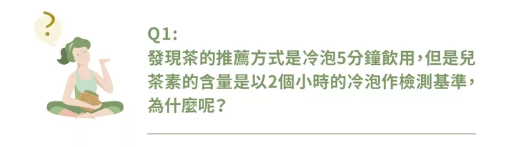 因為兒茶素綠茶經過「重揉捻和低溫細切」加工後,在5分鐘左右就有足夠的風味可以飲用;但此時的兒茶素尚未釋放完全,因此建議飲用時可以適量喝,總浸泡及飲用時間2小時之後,所內含的兒茶素含量就能充分釋放。