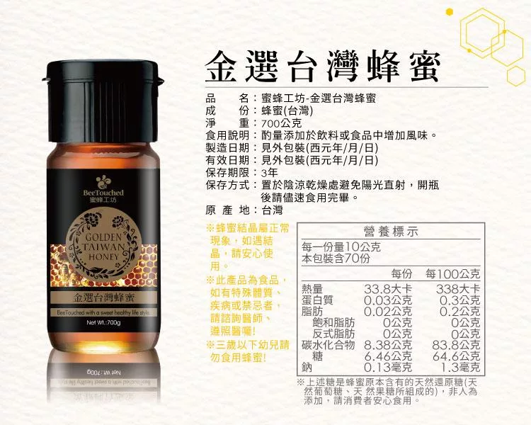 【品 名】Name:【蜜蜂工坊-金選台灣蜂蜜】 Natural Taiwan Honey