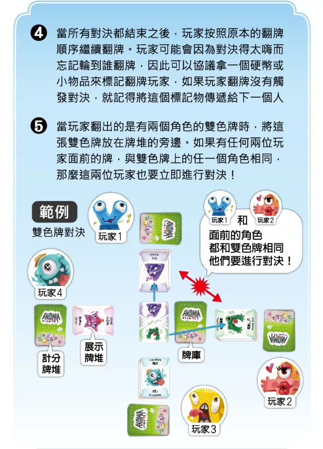 從此玩家的角色若與雙色牌上的角色相同時,亦會觸發對決。