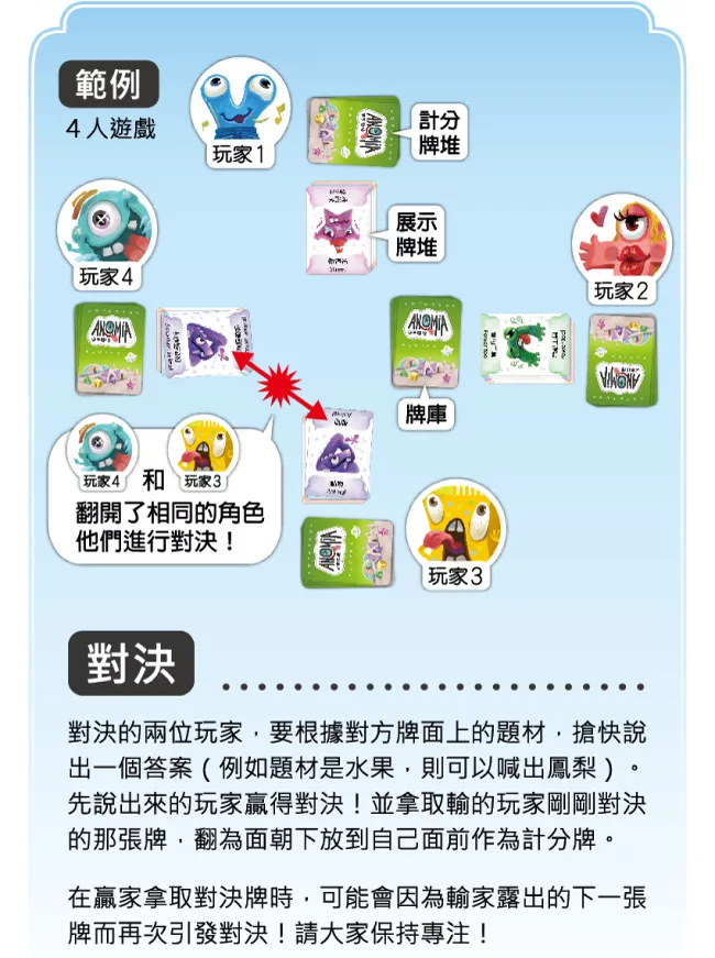 參與對決的二位玩家,必須說出對方牌面上題材的答案。