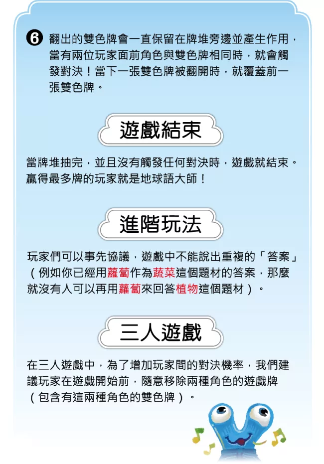 考驗反應力與表達能力,與別人進行對決,贏得最多牌的玩家獲勝。