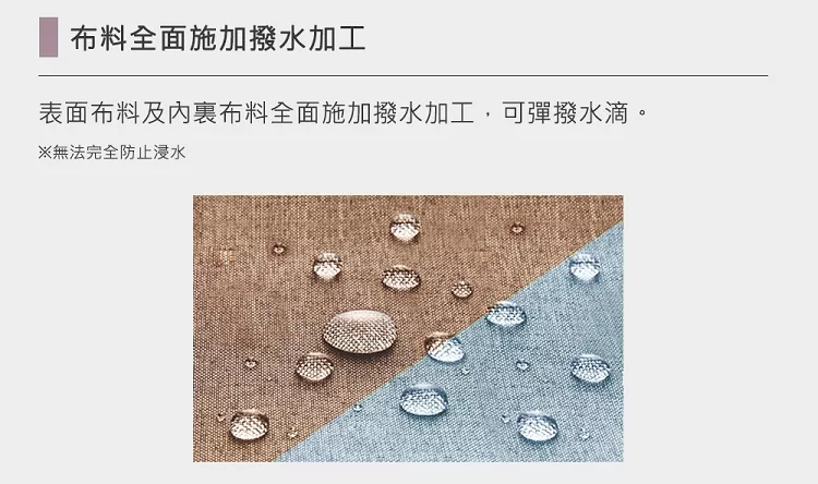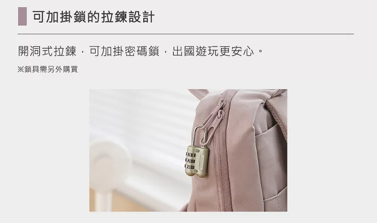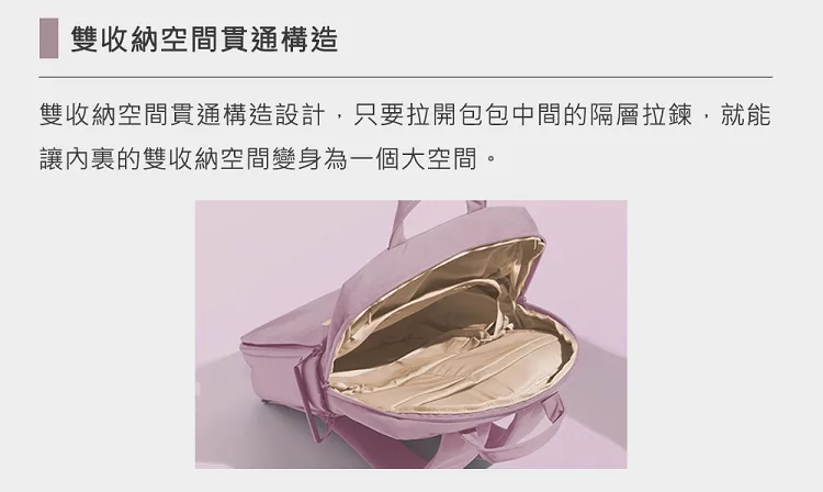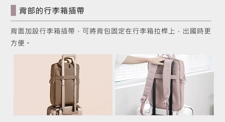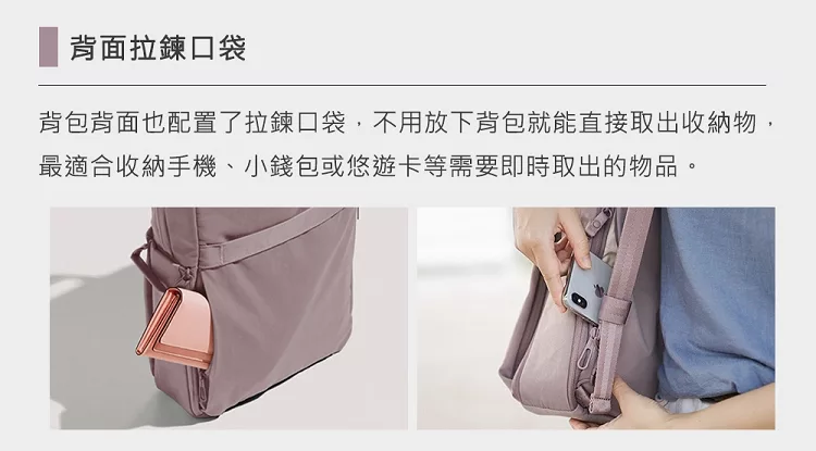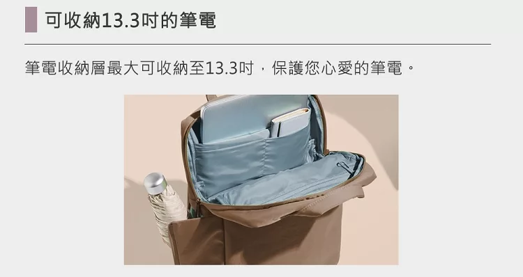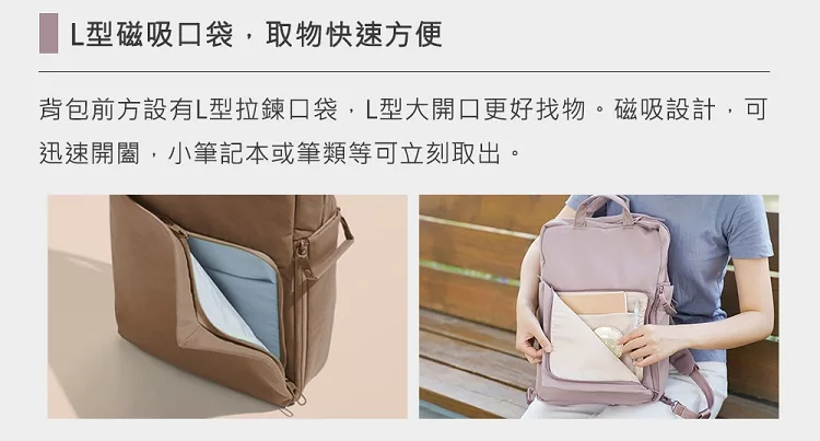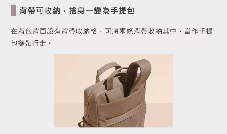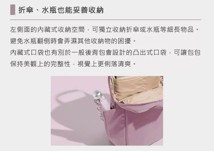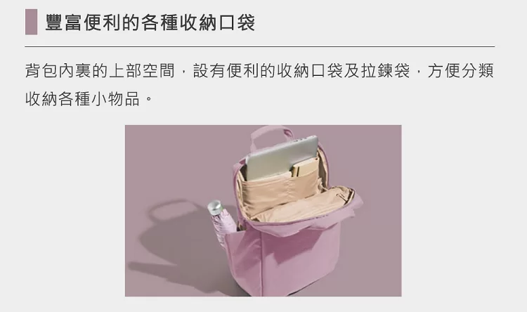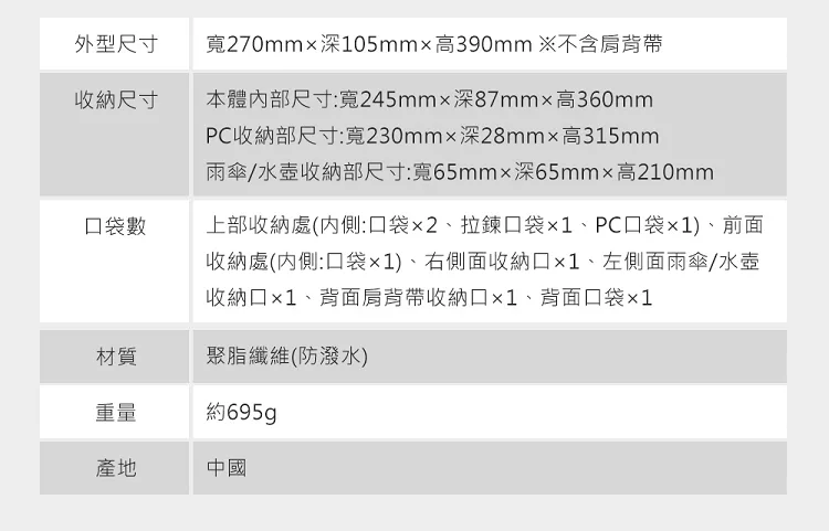 | 口袋數 | 上部收納處(内側:口袋×2、拉鍊口袋×1、PC口袋×1)、前面收納處 (内側:口袋×1)、右側面收納口×1、左側面雨傘/水壺收納口×1、背面肩背帶收納口×1、背面口袋×1 |