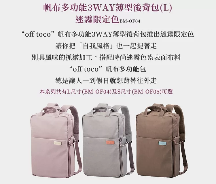 “off toco”帆布多功能3WAY薄型後背包限定色款,讓你把「自我風格」也一起提著走。秋冬色新上市