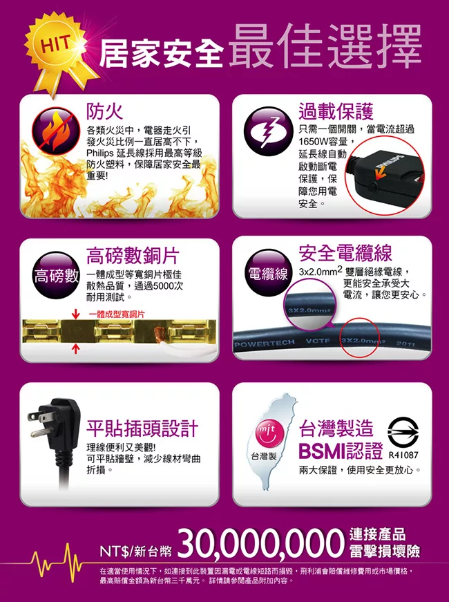 【PHILIPS 飛利浦】4開4插3孔延長線 (1.8米)黑色