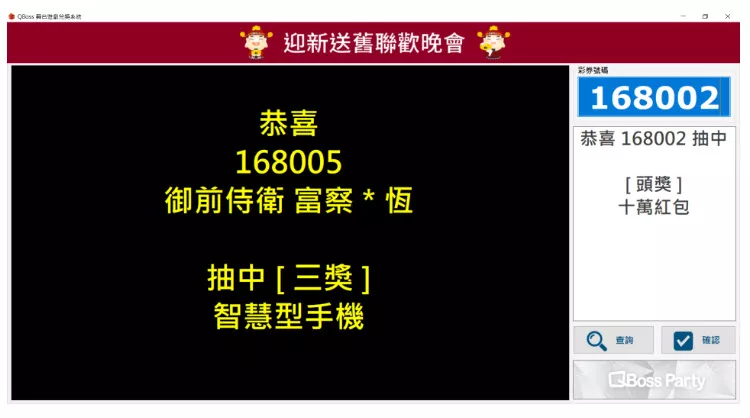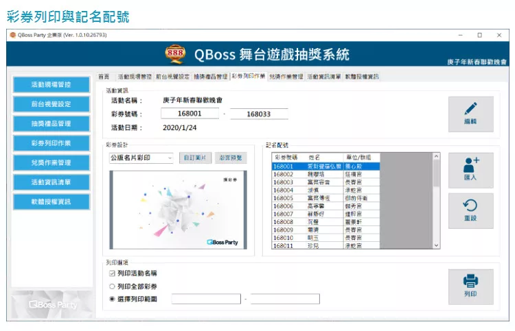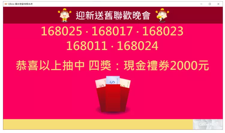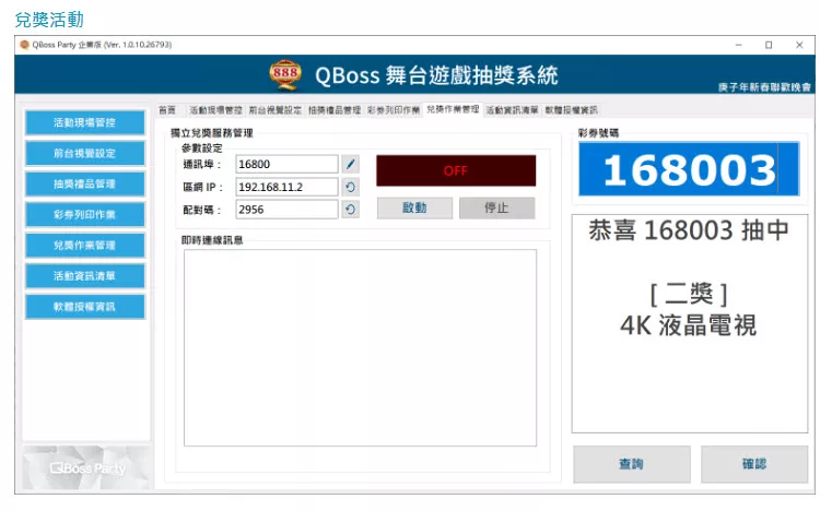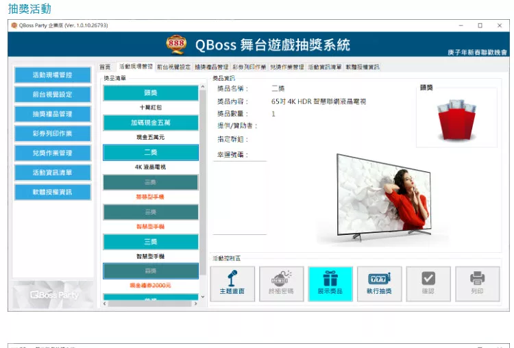 QBoss 舞台遊戲抽獎系統是一套包含舞台遊戲、抽獎、兌獎、彩券列印等多功能的抽獎活動管理系統,
