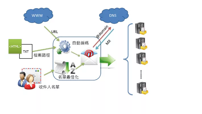 內建 SMTP Server,只需要選擇要寄送的檔案或網址,並提供收件人Email名單,不需架設 Mail Server,就能輕輕鬆鬆的透過它來發送電子郵件。