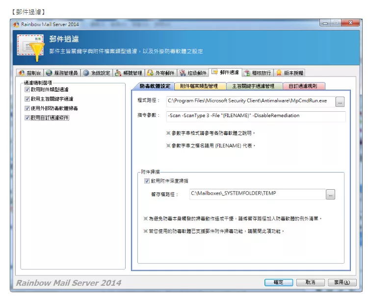 並可外掛防毒軟體執行附件深度掃毒,以及郵件答錄機、自動備份、郵件稽核、企業簽名等進階功能。簡便的安裝方式與人性化的管理介面,適合一般中小企業使用。