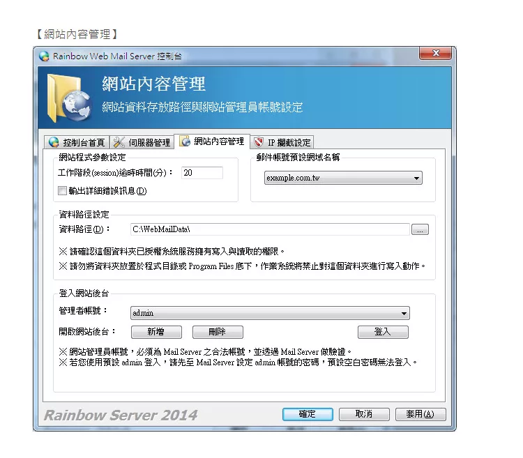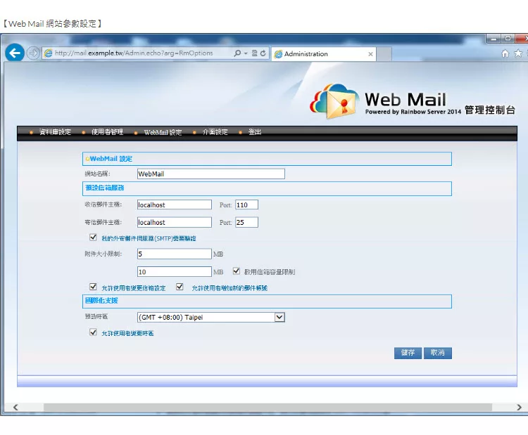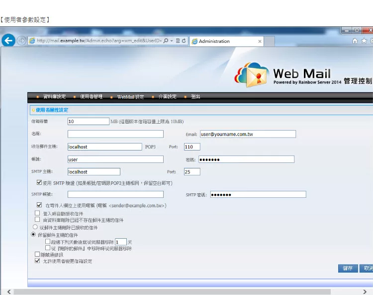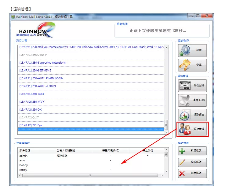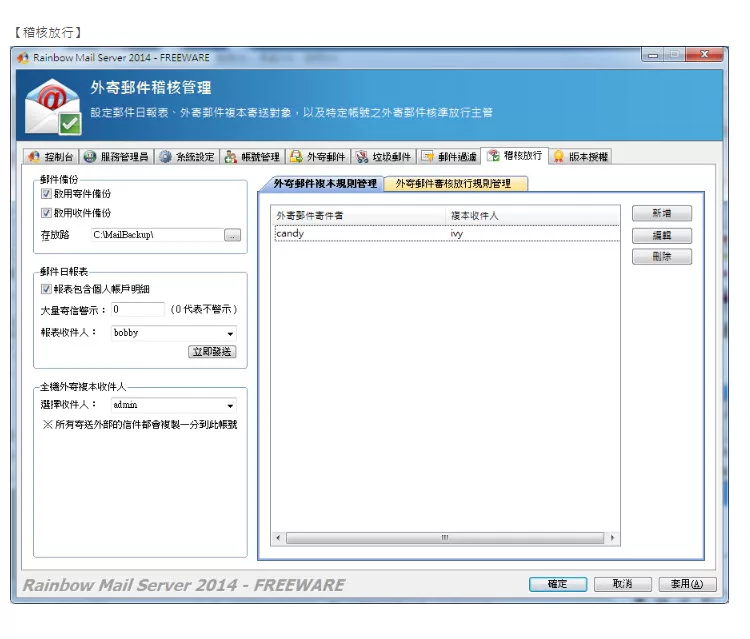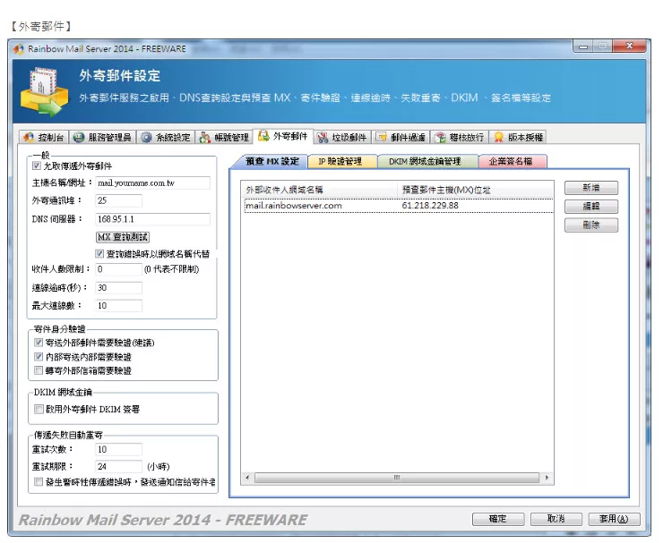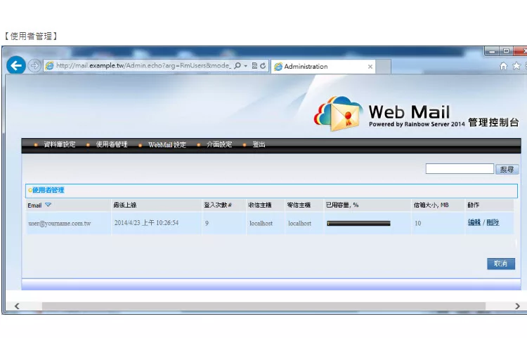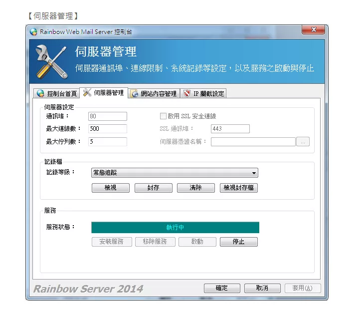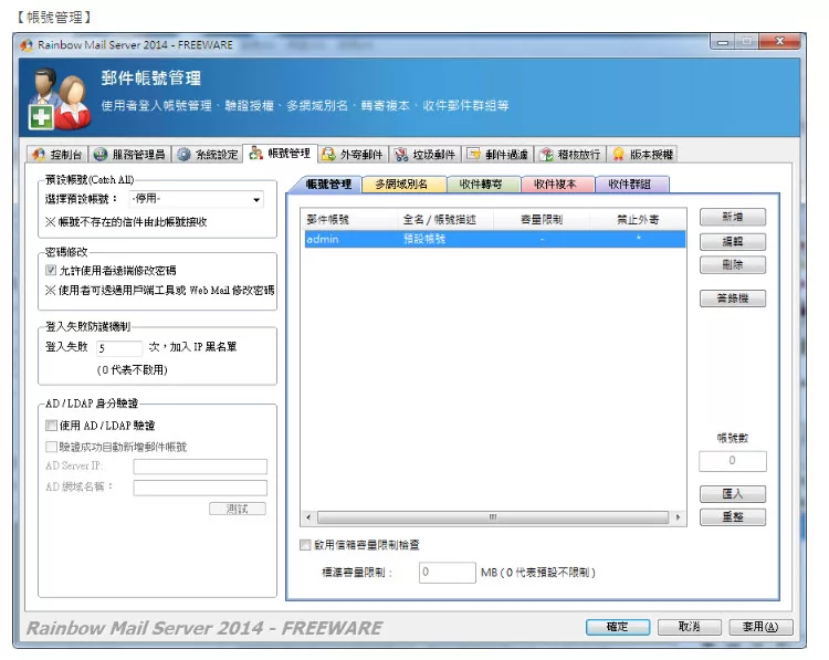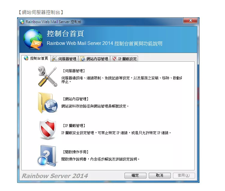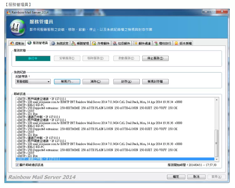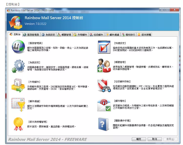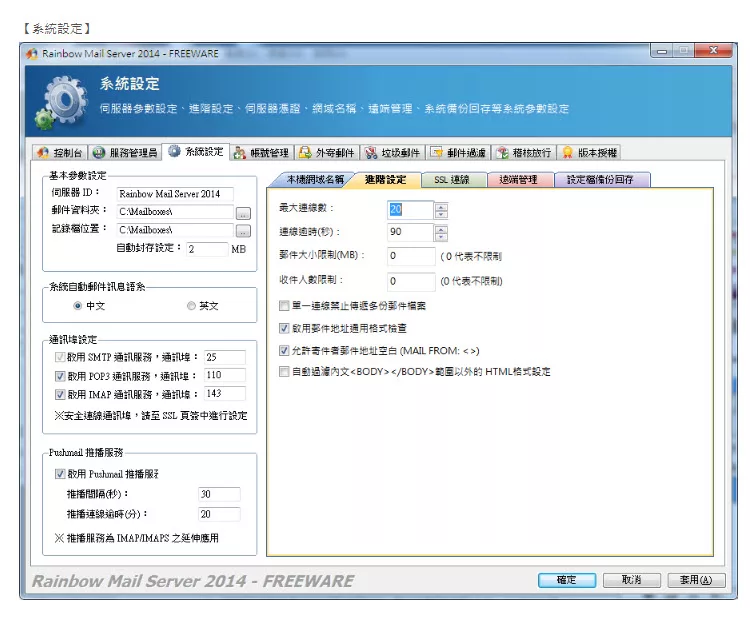 彩虹郵件伺服器(Rainbow Mail Server)是ㄧ套支援標準 SMTP/POP3/IMAP 的郵件伺服器,