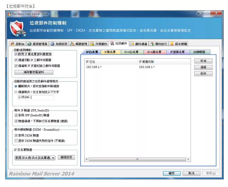支援SSL 及 IPv4/IPv6 雙 IP 機制,採用雲端概念式垃圾郵件防護機制、並支援DKIM、SPF 驗證,內建垃圾郵件過濾、