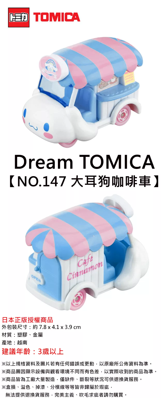 【日本正版授權】Dream TOMICA NO.147 大耳狗 咖啡車 玩具車 喜拿 Cinnamoroll 多美小汽車 887232