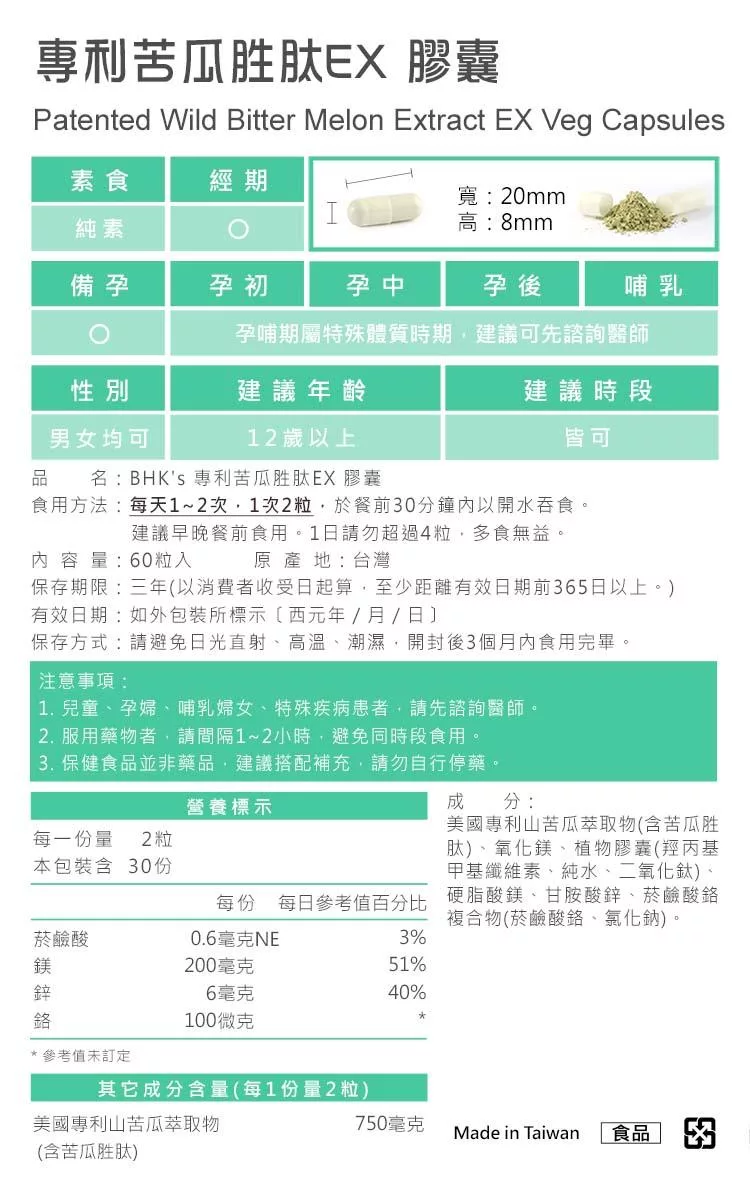 BHK’s 專利苦瓜胜肽EX 素食膠囊 (60粒/盒)
