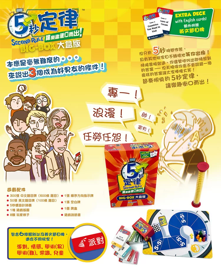 派對、常識、情感、兒童、學術(易)、學術(難)與英文題卡,
