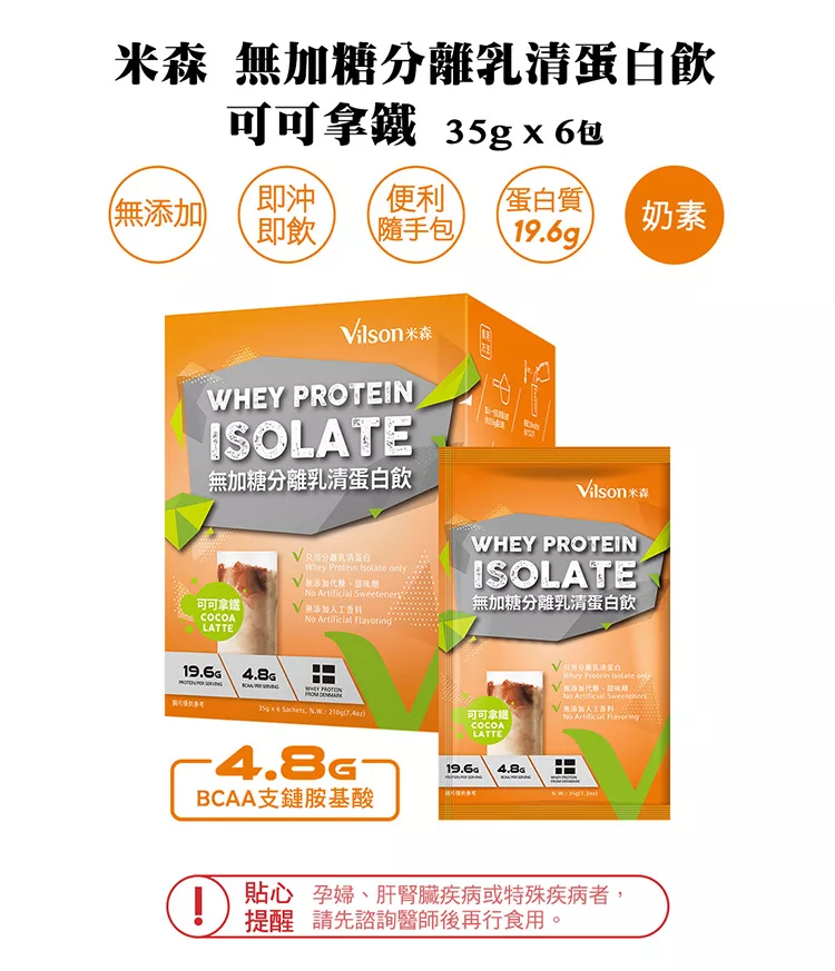 【vilson 米森】無加糖分離乳清蛋白飲 可可拿鐵(35gx6包/盒)