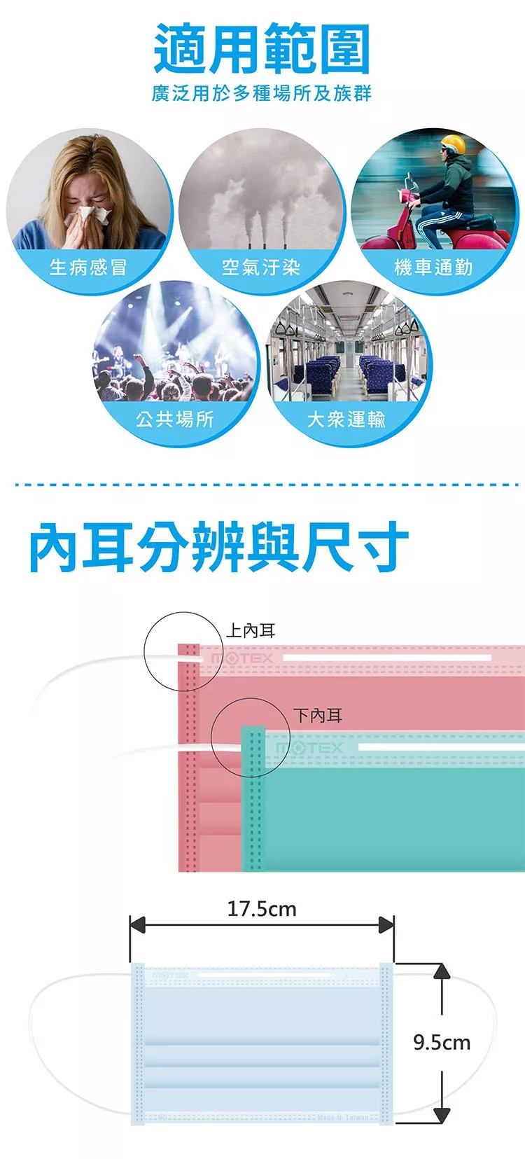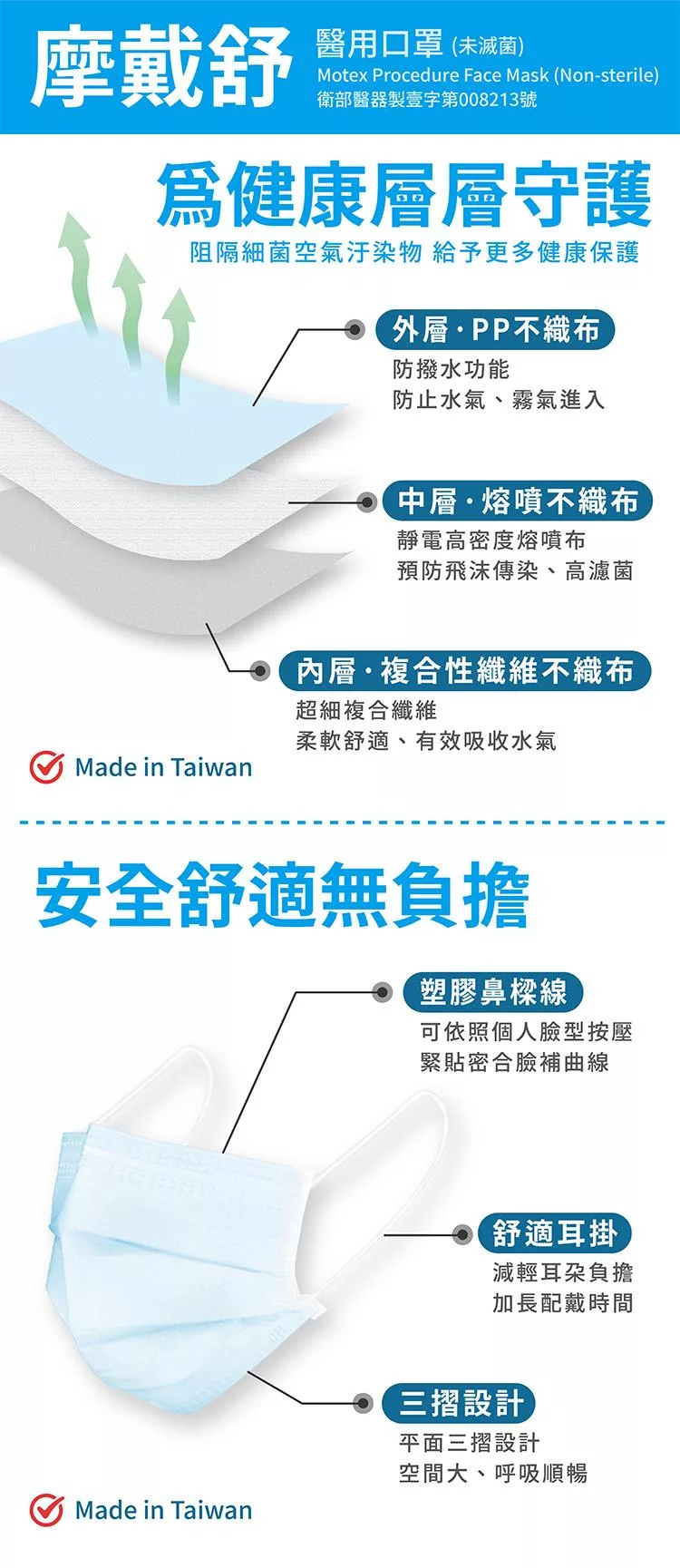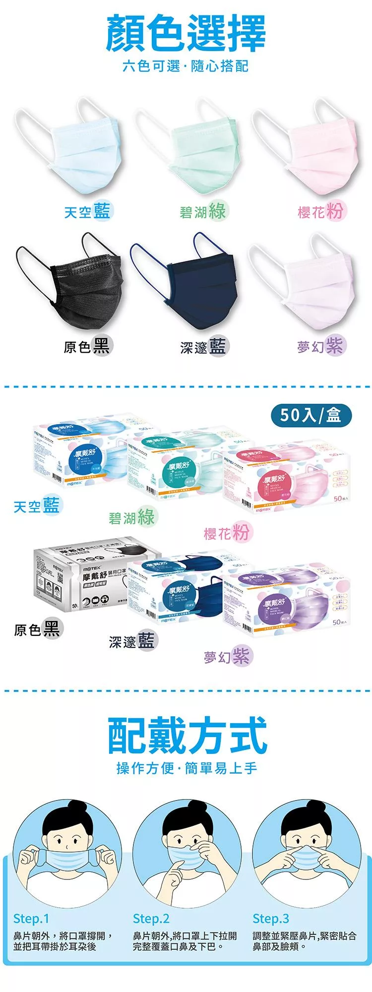 【MOTEX 摩戴舒】平面醫用口罩 (50片盒)外耳掛 天空藍