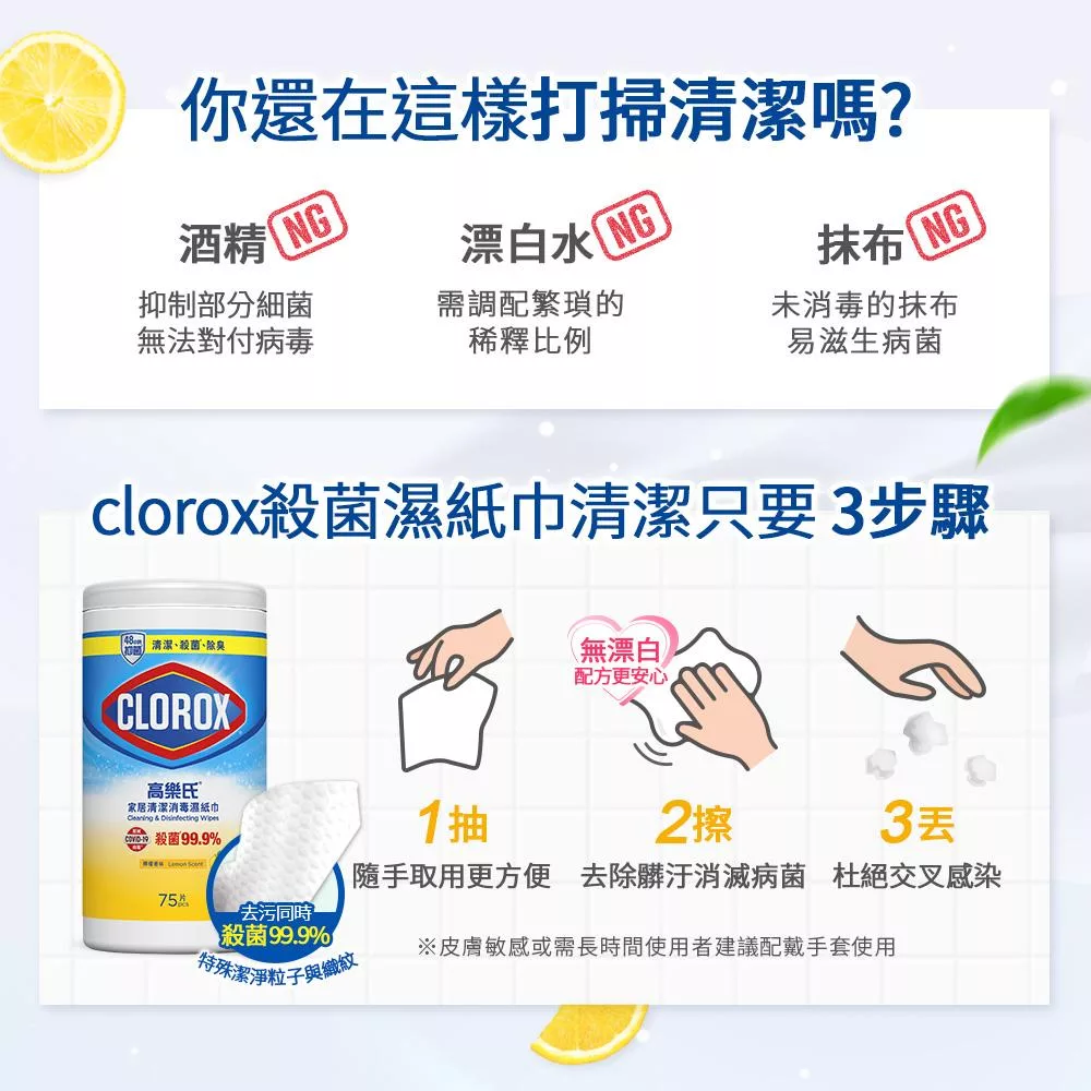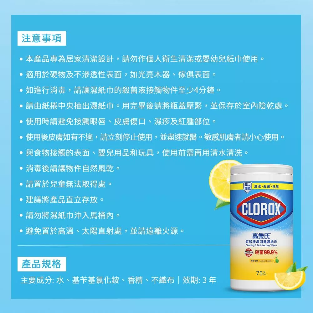 【Clorox 高樂氏】居家清潔殺菌濕紙巾-檸檬香75片(廚房油汙/環境消毒/消滅流感腸菌病毒/無酒精) 75片-檸檬香