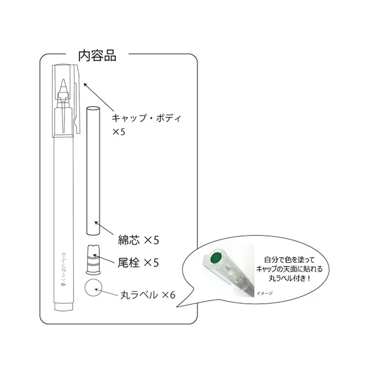 ⑦用完成的筆將顏色塗在附屬的圓形標籤上,並貼到筆蓋上方,可作為顏色樣本使用。